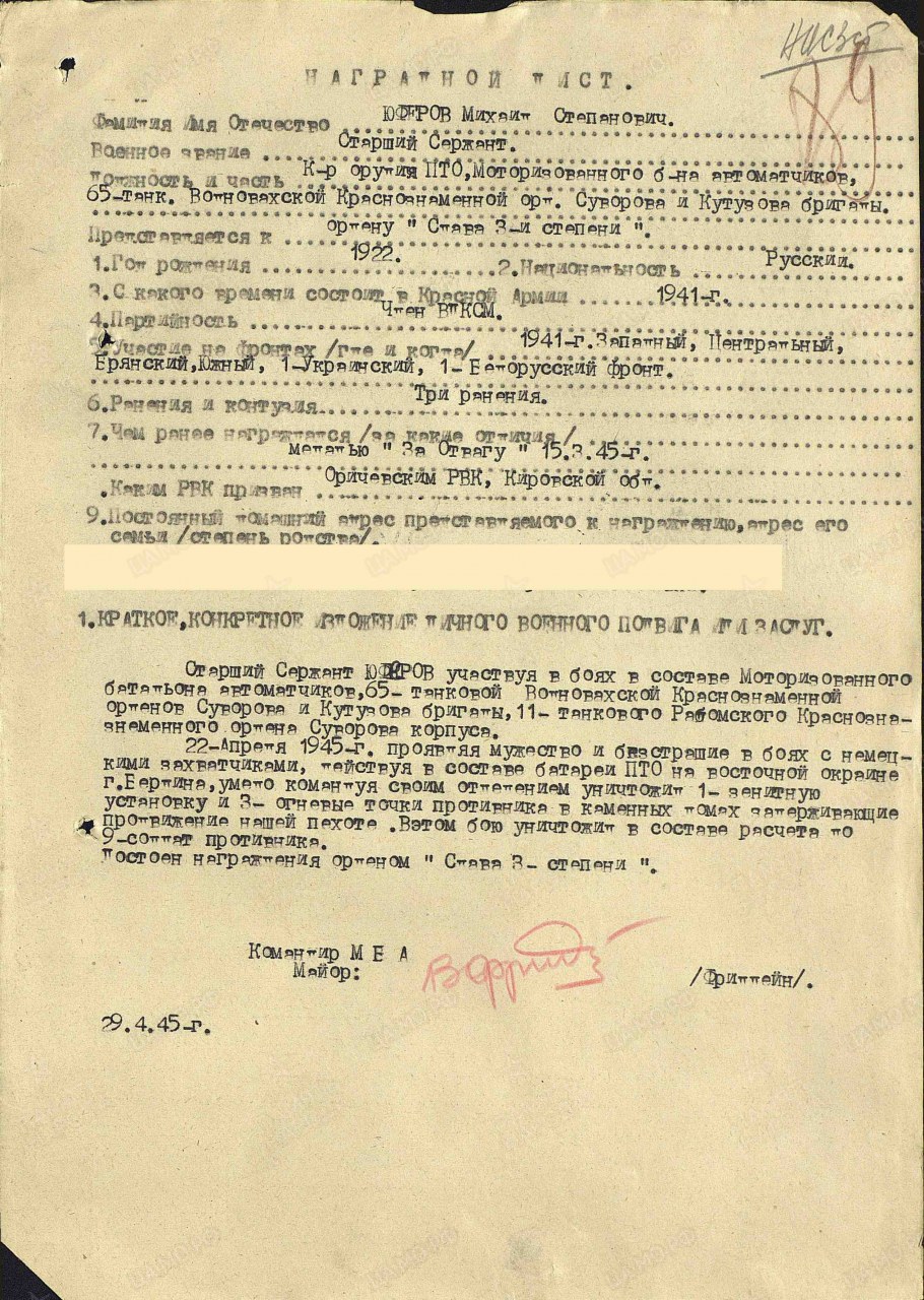 | Награждён: орден Славы III степени | 05.06.1945 | Приказ № 74/н по 11 тк | |