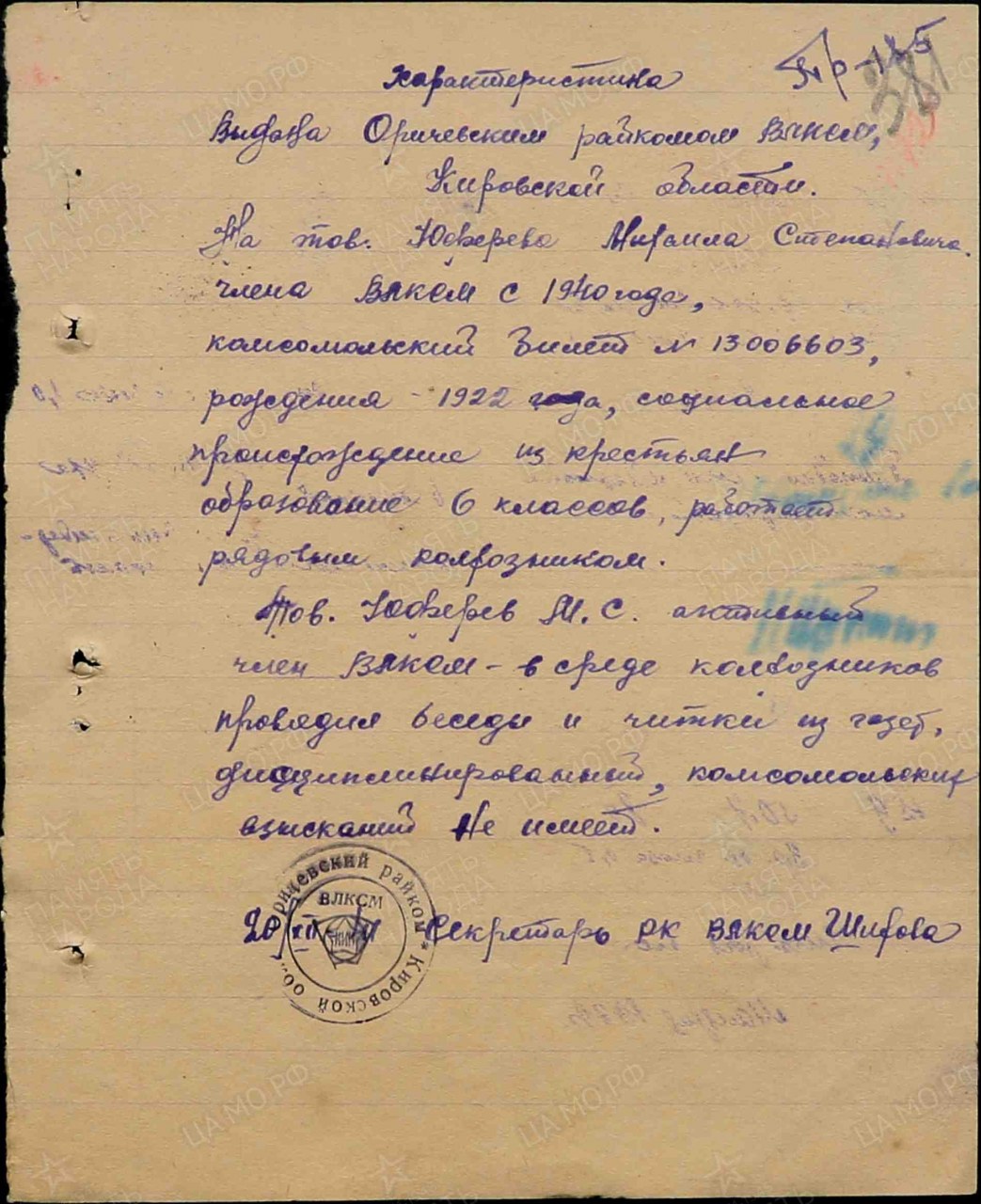 Юферев Михаил Степанович, 22.11.1922 г.р., уроженец д. Лукошинцы Шабарденского с/с. Член ВЛКСМ. Мобилизован 20.12.1941 г. Оричевским РВК. Красноармеец, 1-й пулеметная рота 206 зсп Западный фронт (до 15.01.1942 г.), 3 Гвардейский полк; Гв. сержант, помощник наводчика станкового пулемета 2 пулеметной роты 6 Гвардейского мотострелкового полка 3 Гвардейской мотострелковой дивизии 5 Армии (на март 1943 г.); гвардии старший сержант, командир орудия ПТО моторизованного батальона автоматчиков 65 танковой бригады 11 тк (на июнь 1945 г.). Имел 3 ранения. Выписки из наградных документов: «В бою за деревню Зайцева 6 марта 1943 года первым поднялся в атаку и огнем из пулемета истребил 12 гитлеровцев и заставил замолчать один ручной пулемет противника»; Действуя в составе батареи ПТО на восточной окраине города Берлина, умело команду своим отделением уничтожил 1 установку и 3 огневые точки противника, в каменных домах задерживающие продвижения нашей пехоты. В этом бою уничтожил в составе расчета до 9 солдат противника». Вернулся с войн. Умер 06.07.1997 г.