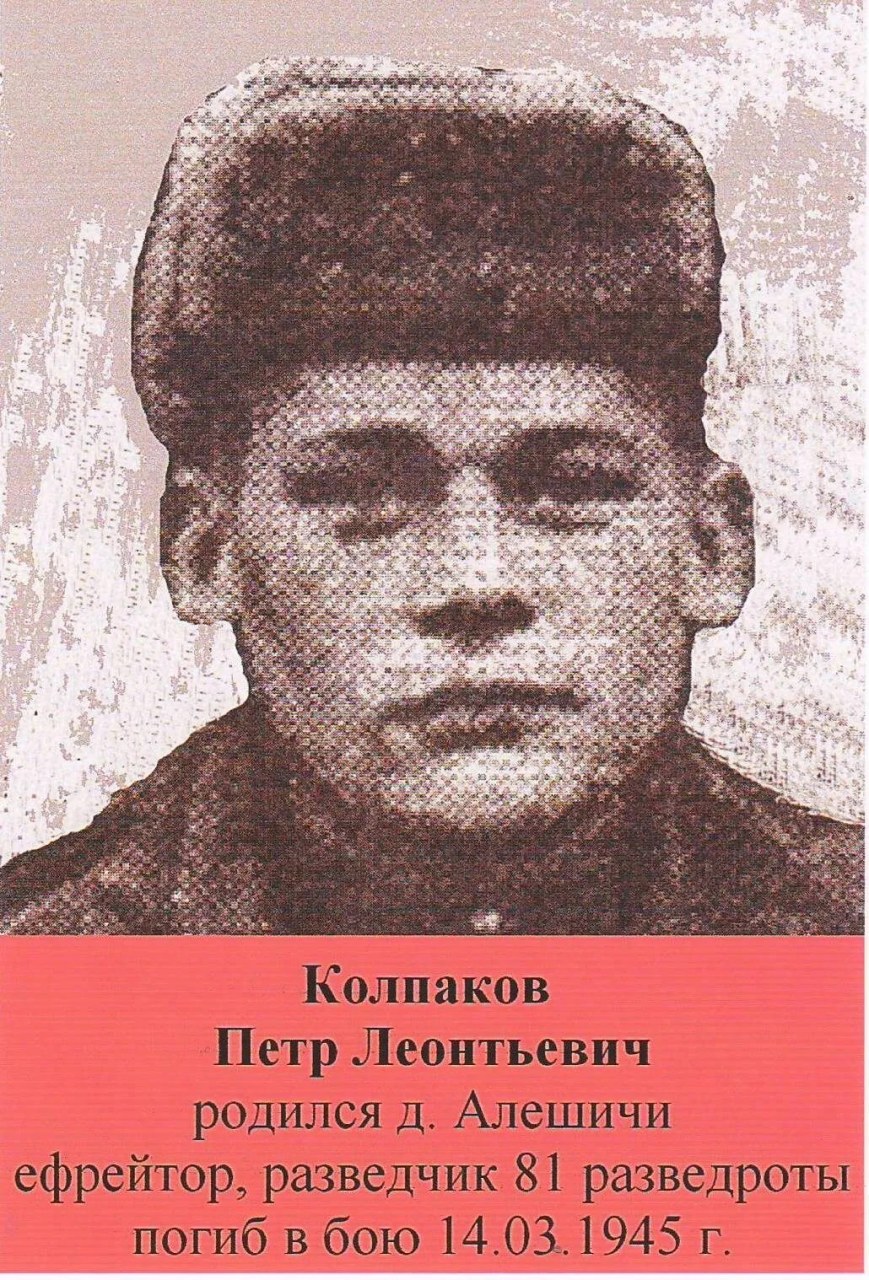Колпаков Пётр Леонтьевич, 1923 г.р., из д. Алешичи Арбажского района. Член ВКП (б). Призван 30.04.1942 г. Арбажским РВК. Гв. ефрейтор, разведчик, 77 Гвардейской стрелковой Черниговской Ордена Ленина Краснознаменной дивизии. Погиб 14.03.1945 г. Первичное место захоронения: Германия, Бранденбург, Франкфуртский р-н, д. Голитц. В послевоенный период данное захоронение было перенесено в н.п. Райтвайн.