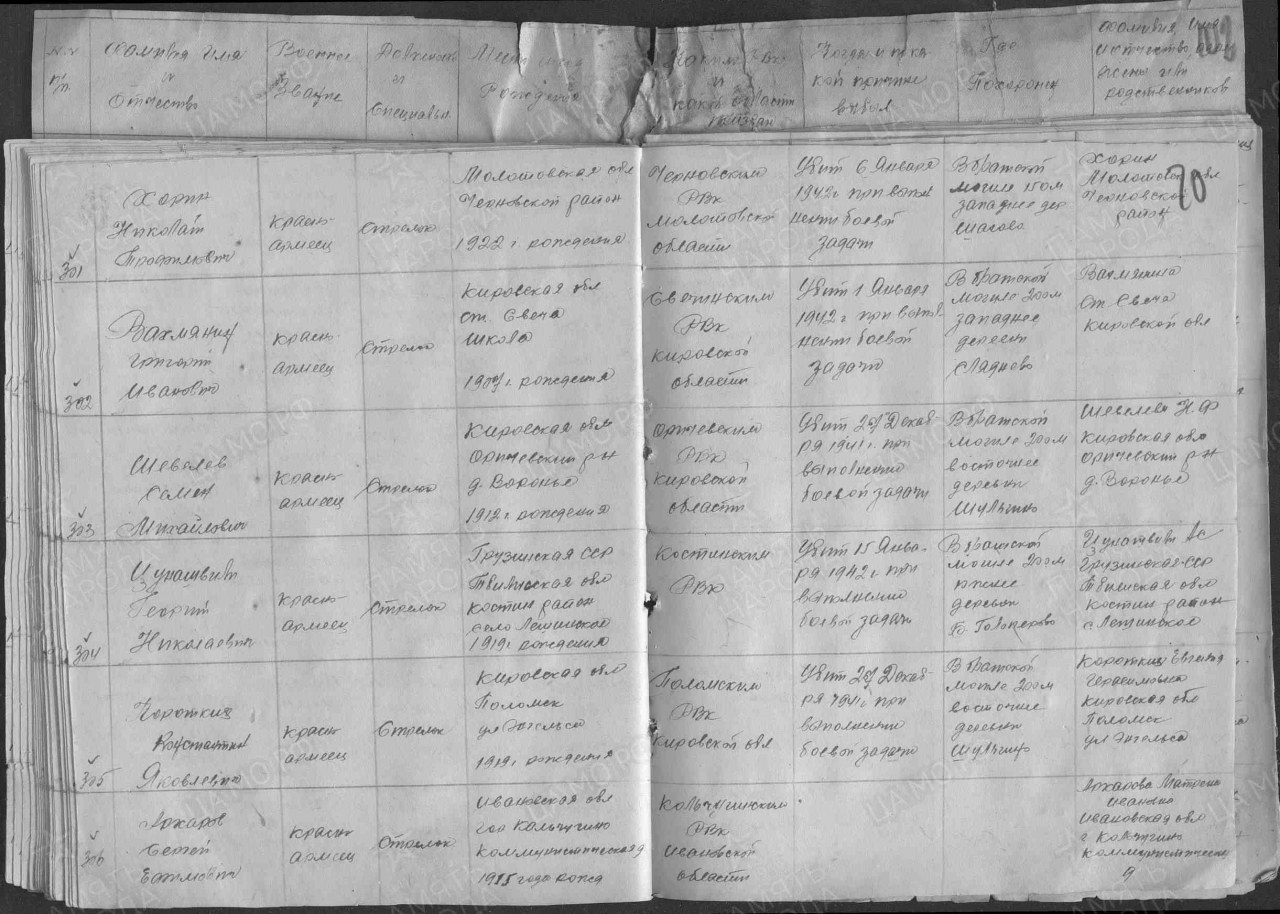 | 4308483019 | ШЕВЕЛЕВ Семен Михайлович | 1912 г. р., д. Воронье Маминского с/с, красноармеец, стрелок, 49 отд. стр. бр., 27.12.1941 г. погиб в бою. Захоронен 200 м вост. д. Шульгино. Комментарий: Ошибочно считается погибшим. Был ранен. Лечился в госпитале ЭГ 1629 Ошибочно внесен в Книгу памяти. Умер 14.10.1992 | Кировская область, Оричевский район |