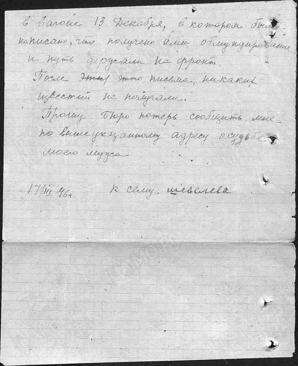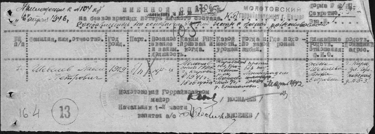 Шевелев Павел Петрович, 1909 г.р., уроженец д. Епимахово Адышевской волости (в настоящее время Оричевский р-н). Проживал в г. Кирове на ул. Гороховской. Мобилизован 18.08.1941 г. Молотовским РВК. Красноармеец. Последнее письмо от 13.12.1941 г. по пути следования на фронт из Челябинской области через Вологду в направление г. Ленинграда. Считается пропавшим без вести в марте 1942 года. Жена - Анна Егоровна.