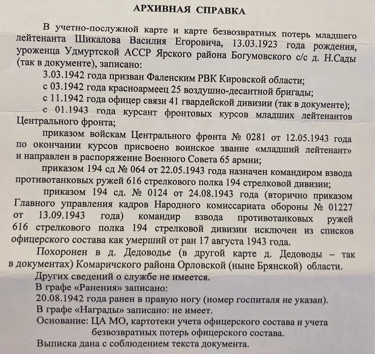 | 1804439048 | ШИКАЛОВ Василий Егорович | род. 1923, д. Ниж. Сада. Мл. лейтенант. Погиб в бою 17 авг. 1942. Похоронен: д. Дедовы Орловской обл. | Удмуртская Республика, Ярский район |