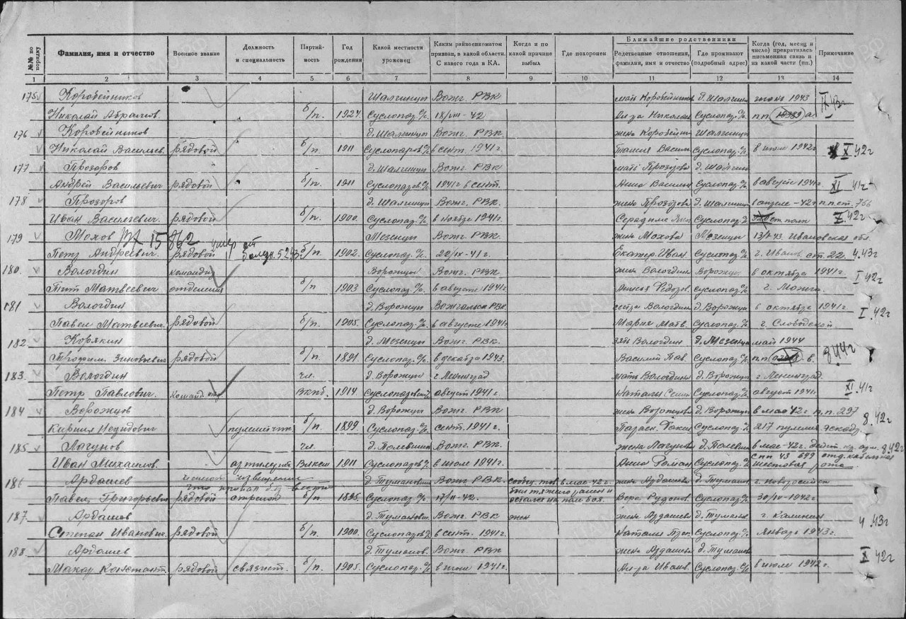 | 4317116007 | ВОРОЖЦОВ Кирилл Нефедович | 1899 г. р., из д. Ворожцы Суслопаровского с/с, призван Вожгальским РВК, красноармеец, пропал без вести 13.08.1942 г. (П.) | Кировская область, Куменский район |