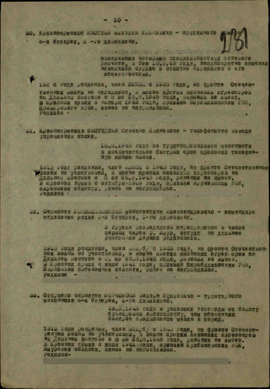 | Награждён: медаль "За боевые заслуги" | 04.09.1945 | Приказ № 2/н по 52 пап РГК 15 А 2 Дальневосточного фронта |
