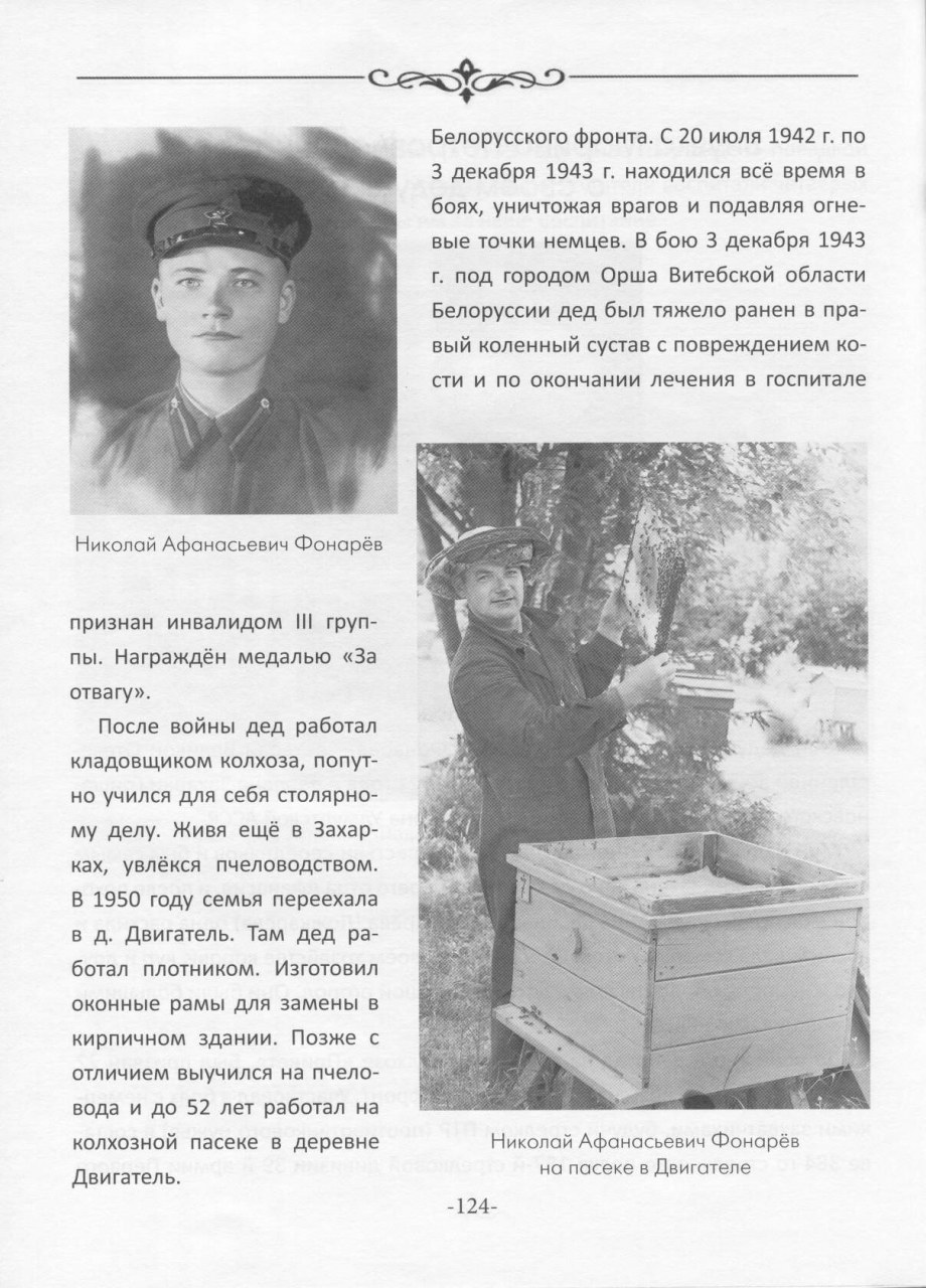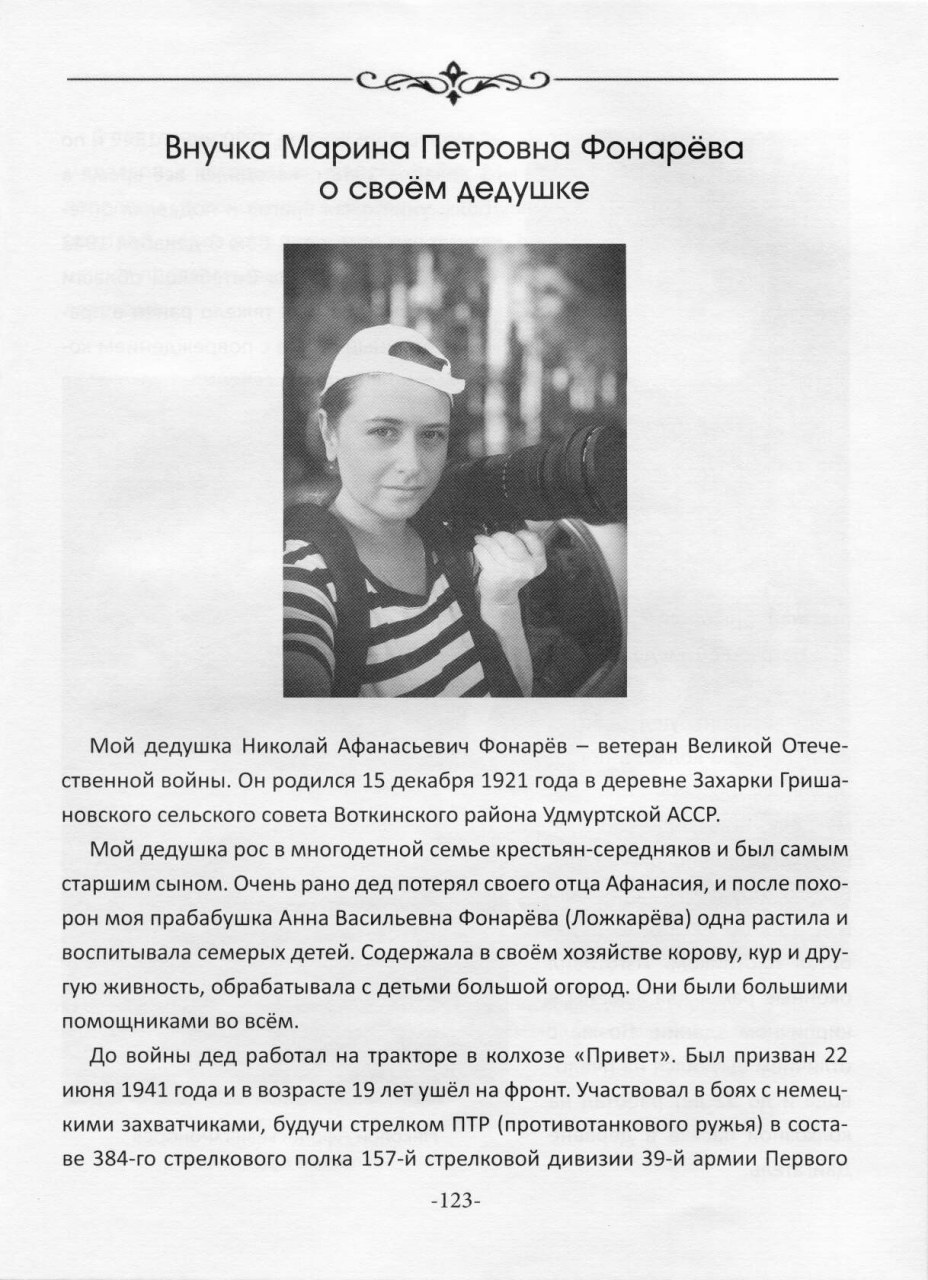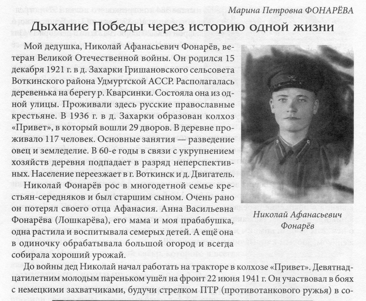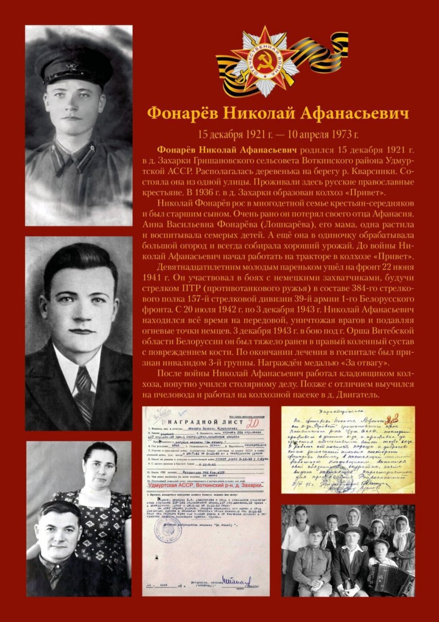 Николай Афанасьевич Фонарёв, родился 15 декабря 1921 года в деревне Захарки Гришановского сельского совета Воткинского района Удмуртской АССР. Располагалась деревенька вдоль течения р. Кварсинки. Состояла она из одной улицы. Проживали здесь русские православные крестьяне. В 1936 г. в д. Захарки образован колхоз «Привет», состоящий из 29 хозяйств. В деревне проживало 117 человек. Основным занятием было разведение овец, земледелие. В 60-е годы в связи с укрупнением хозяйств деревня попадает в разряд неперспективных. Население переезжает в г. Воткинск и д. Двигатель. Николай Фонарёв рос в многодетной семье крестьян-середняков и был самым старшим сыном. Очень рано дед Николай потерял своего отца Афанасия Федоровича и после похорон моя прабабушка Анна Васильевна Фонарёва (Лошкарёва) одна растила и воспитывала семерых детей. А ещё она в одиночку обрабатывала большой огород и собирала хороший урожай. До войны дед Николай начал работать на тракторе в колхозе «Привет». В возрасте 19 лет молодым пареньком ушёл на фронт. Рядовой Фонарёв Николай Афанасьевич был призван 22 июня 1941 года. Он участвовал в боях с немецкими захватчиками будучи стрелком ПТР (противотанкового ружья) в составе 384-го стрелкового полка 157-й стрелковой дивизии 39-й армии 1-го Белорусского фронта. С 20 июля 1942 г. по 3 декабря 1943 г. мой дед Николай Афанасьевич находился всё время в боях, уничтожая врагов и подавляя огневые точки немцев. В бою 3 декабря 1943 г. под городом Орша Витебской области Белоруссии дед был тяжело ранен в правый коленный сустав с повреждением кости и по окончании лечения в госпитале признан инвалидом 3-й группы. Награждён медалью «За отвагу». После войны дед работал кладовщиком колхоза, попутно учился для себя столярному делу, также изготавливал оконные рамы для деревенской конторы. Позже с отличием выучился на пчеловода и до 52 лет работал на колхозной пасеке в деревне Двигатель. С тех давних лет сохранились награды, фотографии нашего дедушки и медальон, с которым он прошёл войну. Мы бережно храним память о нём, передаём из поколения в поколение. Дедушку я никогда не видела, так как родилась через 5 лет после его смерти. Мы любим, помним и гордимся нашим предком ветераном войны, тружеником, добрым и отзывчивым человеком!!!
