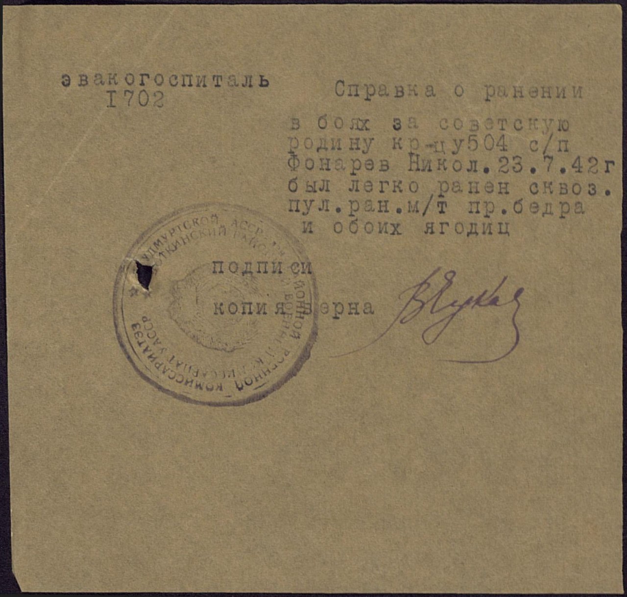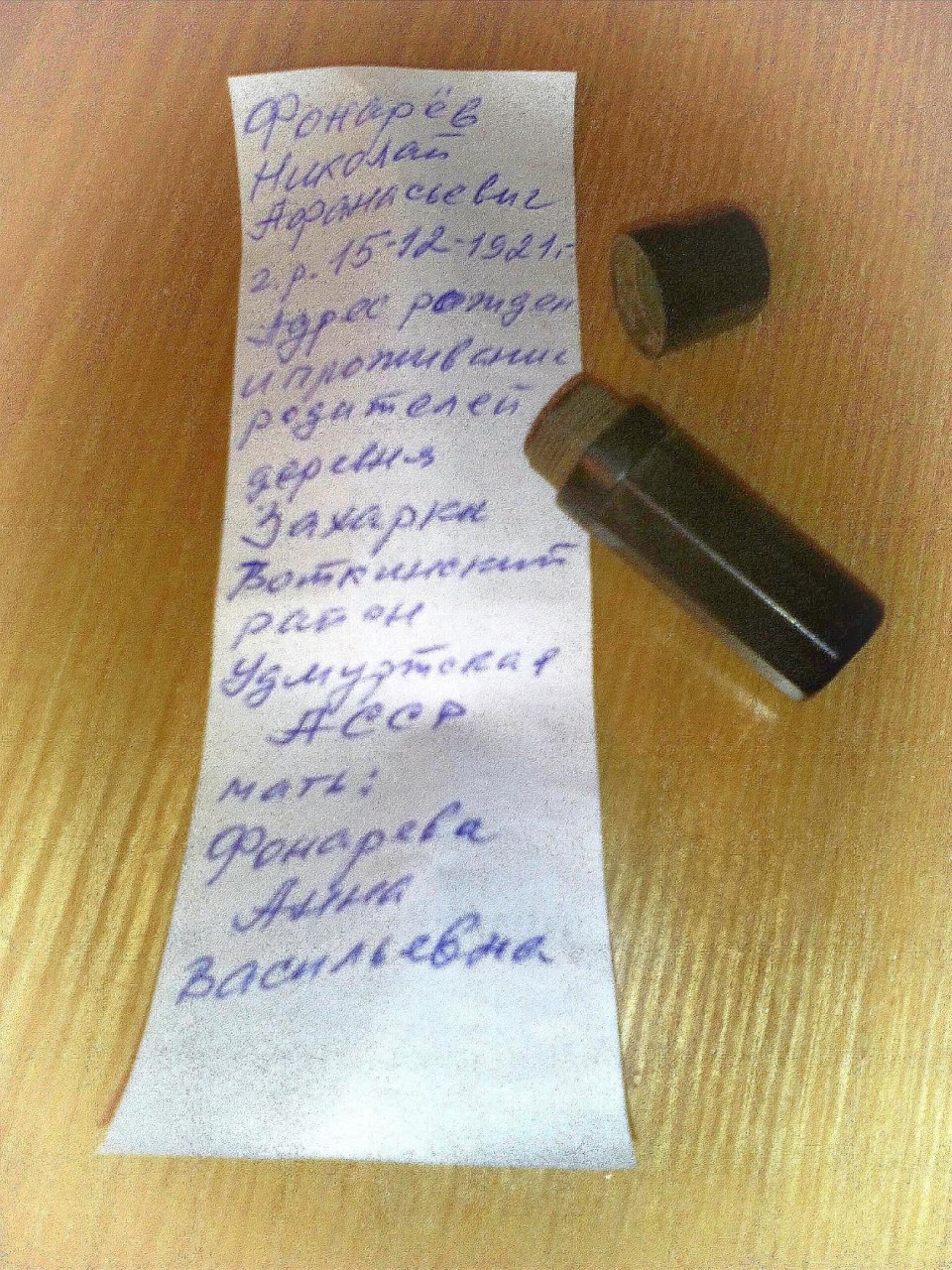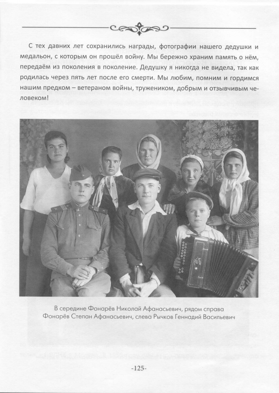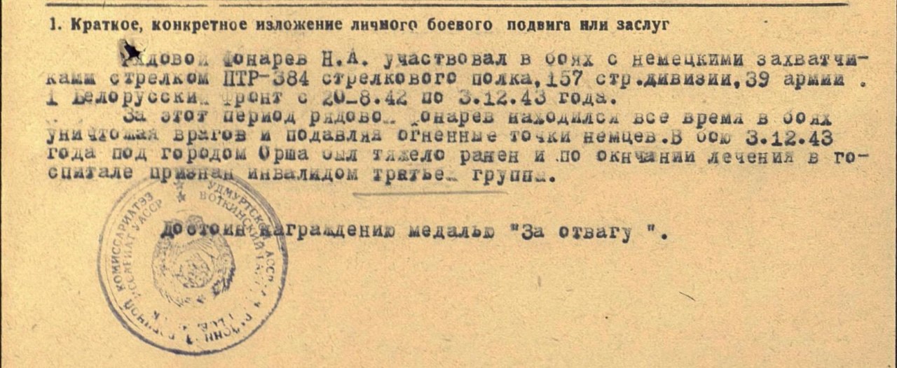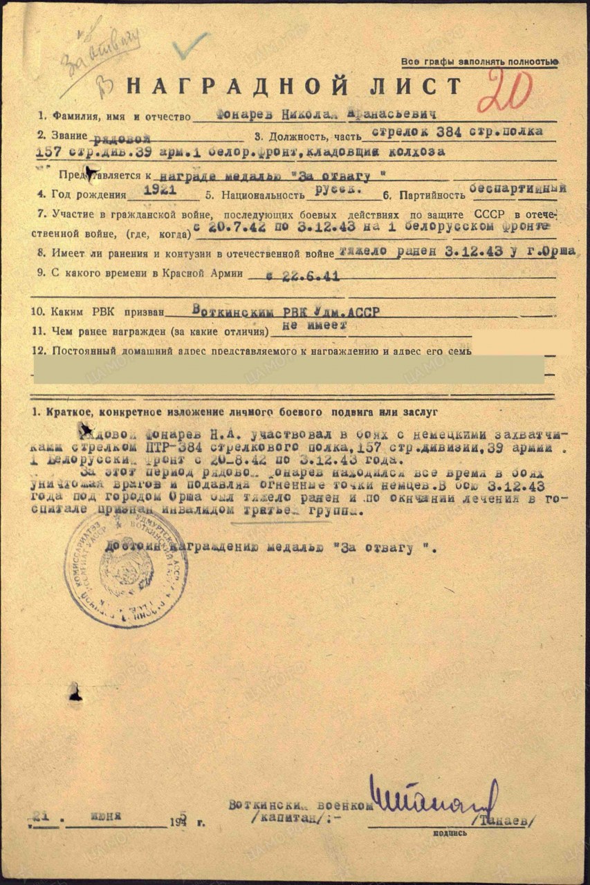 Николай Афанасьевич Фонарёв, родился 15 декабря 1921 года в деревне Захарки Гришановского сельского совета Воткинского района Удмуртской АССР. Располагалась деревенька вдоль течения р. Кварсинки. Состояла она из одной улицы. Проживали здесь русские православные крестьяне. В 1936 г. в д. Захарки образован колхоз «Привет», состоящий из 29 хозяйств. В деревне проживало 117 человек. Основным занятием было разведение овец, земледелие. В 60-е годы в связи с укрупнением хозяйств деревня попадает в разряд неперспективных. Население переезжает в г. Воткинск и д. Двигатель. Николай Фонарёв рос в многодетной семье крестьян-середняков и был самым старшим сыном. Очень рано дед Николай потерял своего отца Афанасия Федоровича и после похорон моя прабабушка Анна Васильевна Фонарёва (Лошкарёва) одна растила и воспитывала семерых детей. А ещё она в одиночку обрабатывала большой огород и собирала хороший урожай. До войны дед Николай начал работать на тракторе в колхозе «Привет». В возрасте 19 лет молодым пареньком ушёл на фронт. Рядовой Фонарёв Николай Афанасьевич был призван 22 июня 1941 года. Он участвовал в боях с немецкими захватчиками будучи стрелком ПТР (противотанкового ружья) в составе 384-го стрелкового полка 157-й стрелковой дивизии 39-й армии 1-го Белорусского фронта. С 20 июля 1942 г. по 3 декабря 1943 г. мой дед Николай Афанасьевич находился всё время в боях, уничтожая врагов и подавляя огневые точки немцев. В бою 3 декабря 1943 г. под городом Орша Витебской области Белоруссии дед был тяжело ранен в правый коленный сустав с повреждением кости и по окончании лечения в госпитале признан инвалидом 3-й группы. Награждён медалью «За отвагу». После войны дед работал кладовщиком колхоза, попутно учился для себя столярному делу, также изготавливал оконные рамы для деревенской конторы. Позже с отличием выучился на пчеловода и до 52 лет работал на колхозной пасеке в деревне Двигатель. С тех давних лет сохранились награды, фотографии нашего дедушки и медальон, с которым он прошёл войну. Мы бережно храним память о нём, передаём из поколения в поколение. Дедушку я никогда не видела, так как родилась через 5 лет после его смерти. Мы любим, помним и гордимся нашим предком ветераном войны, тружеником, добрым и отзывчивым человеком!!!