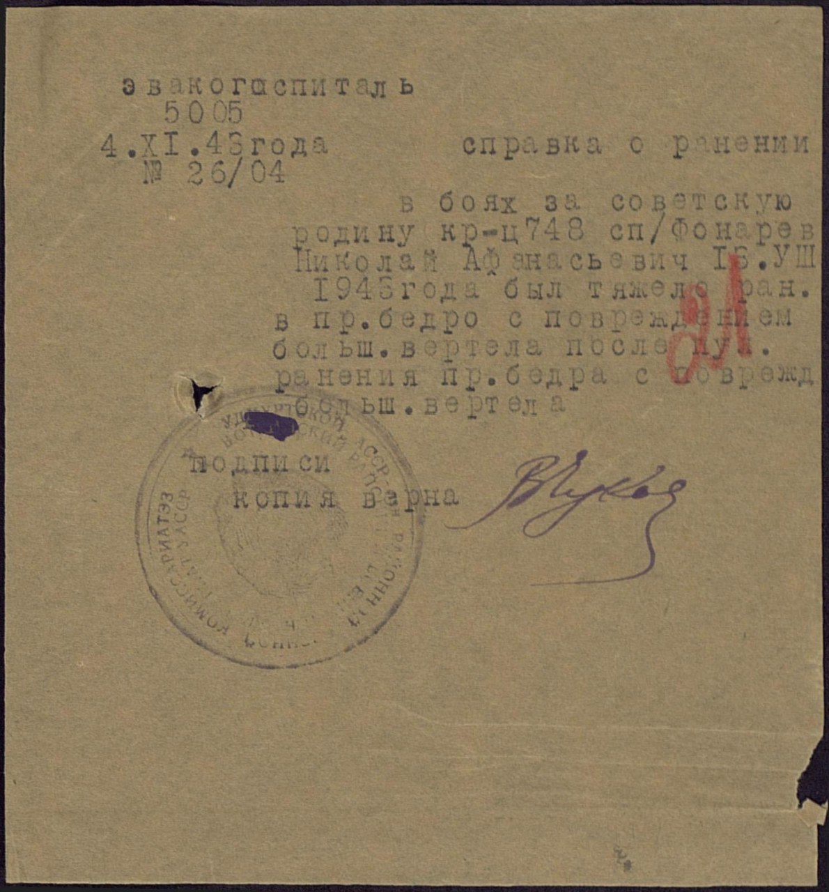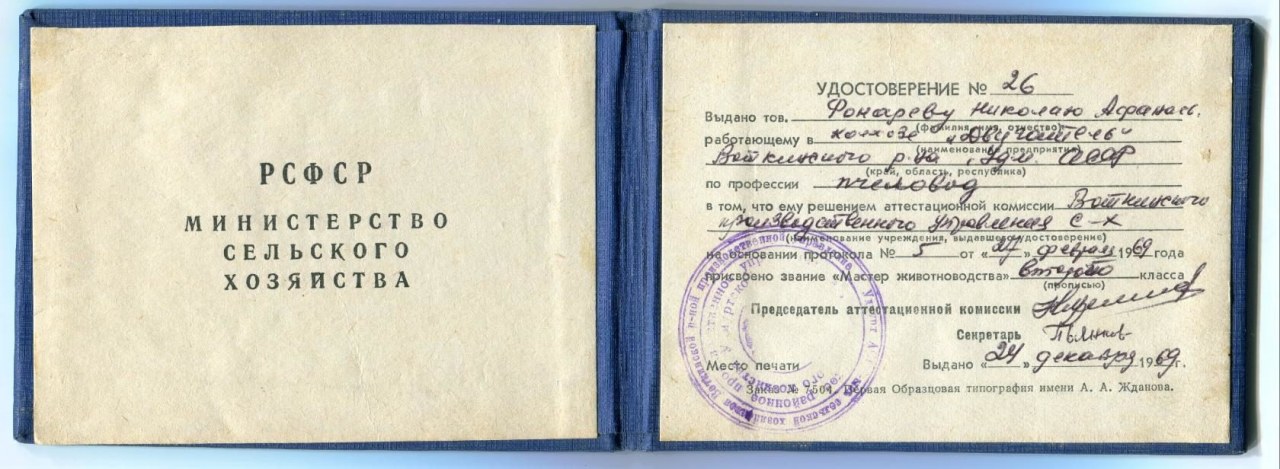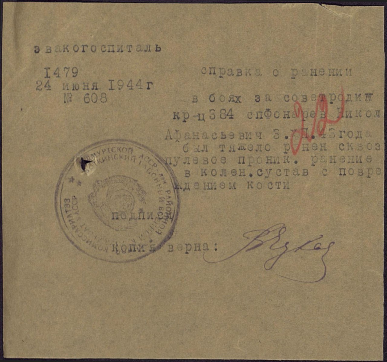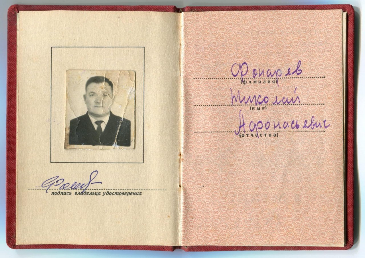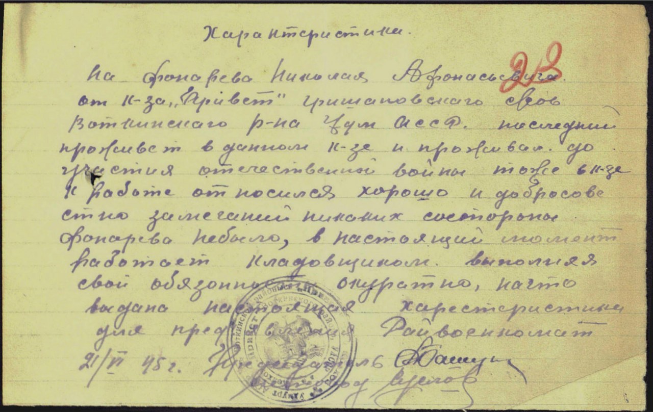 Николай Афанасьевич Фонарёв, родился 15 декабря 1921 года в деревне Захарки Гришановского сельского совета Воткинского района Удмуртской АССР. Располагалась деревенька вдоль течения р. Кварсинки. Состояла она из одной улицы. Проживали здесь русские православные крестьяне. В 1936 г. в д. Захарки образован колхоз «Привет», состоящий из 29 хозяйств. В деревне проживало 117 человек. Основным занятием было разведение овец, земледелие. В 60-е годы в связи с укрупнением хозяйств деревня попадает в разряд неперспективных. Население переезжает в г. Воткинск и д. Двигатель. Николай Фонарёв рос в многодетной семье крестьян-середняков и был самым старшим сыном. Очень рано дед Николай потерял своего отца Афанасия Федоровича и после похорон моя прабабушка Анна Васильевна Фонарёва (Лошкарёва) одна растила и воспитывала семерых детей. А ещё она в одиночку обрабатывала большой огород и собирала хороший урожай. До войны дед Николай начал работать на тракторе в колхозе «Привет». В возрасте 19 лет молодым пареньком ушёл на фронт. Рядовой Фонарёв Николай Афанасьевич был призван 22 июня 1941 года. Он участвовал в боях с немецкими захватчиками будучи стрелком ПТР (противотанкового ружья) в составе 384-го стрелкового полка 157-й стрелковой дивизии 39-й армии 1-го Белорусского фронта. С 20 июля 1942 г. по 3 декабря 1943 г. мой дед Николай Афанасьевич находился всё время в боях, уничтожая врагов и подавляя огневые точки немцев. В бою 3 декабря 1943 г. под городом Орша Витебской области Белоруссии дед был тяжело ранен в правый коленный сустав с повреждением кости и по окончании лечения в госпитале признан инвалидом 3-й группы. Награждён медалью «За отвагу». После войны дед работал кладовщиком колхоза, попутно учился для себя столярному делу, также изготавливал оконные рамы для деревенской конторы. Позже с отличием выучился на пчеловода и до 52 лет работал на колхозной пасеке в деревне Двигатель. С тех давних лет сохранились награды, фотографии нашего дедушки и медальон, с которым он прошёл войну. Мы бережно храним память о нём, передаём из поколения в поколение. Дедушку я никогда не видела, так как родилась через 5 лет после его смерти. Мы любим, помним и гордимся нашим предком ветераном войны, тружеником, добрым и отзывчивым человеком!!!