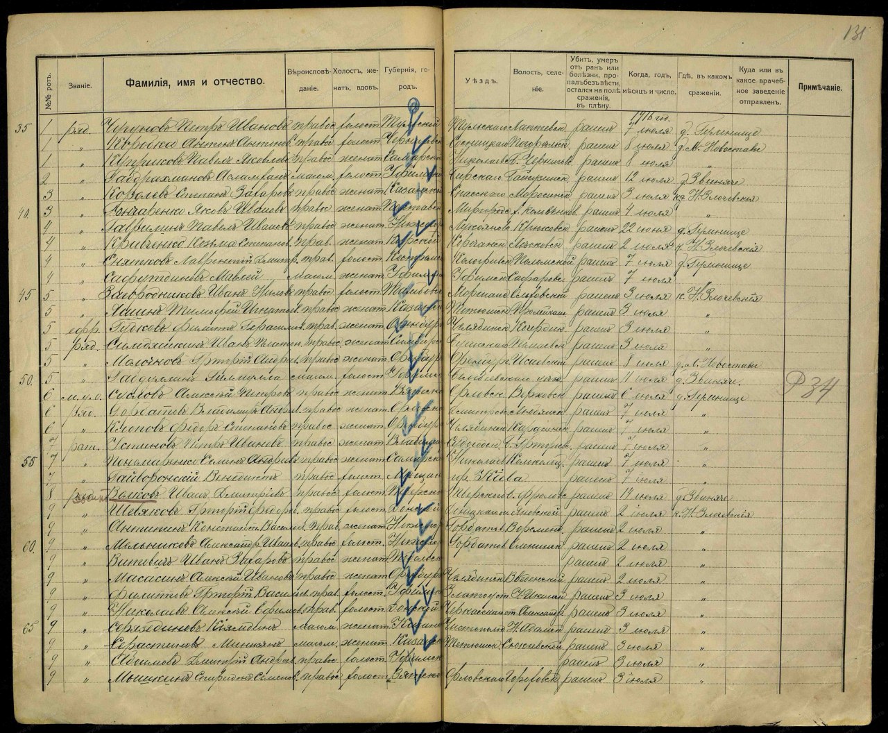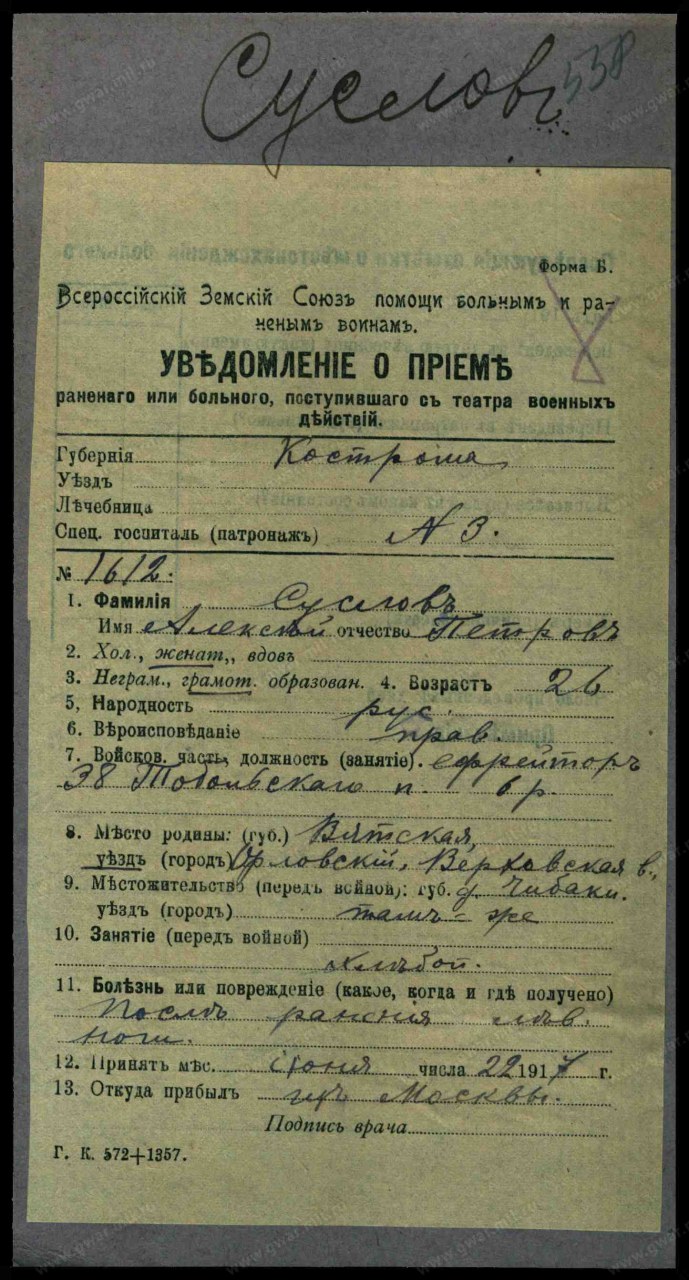 | участие в Первой Мировой войне | 1914 - 1916 | 38-й пехотный Тобольский полк | Должность/Звание ефрейтор Воинская часть 38-й пехотный Тобольский полк Место рождения Вятская губ., Орловский уезд, Верховская вол., д. Чибаки Причина выбытия ранен/контужен Дата события 22.06.1917 Тип документа Уведомление о приеме раненого Архив Российский Государственный Военно-исторический архив Фонд Картотека бюро учета потерь в Первой мировой войне (офицеров и солдат) Шкаф без номера Ящик 3391-С Должность/Звание мл. унтер-офицер Воинская часть 38-й пехотный Тобольский полк Место рождения Вятская губ., Орловский уезд, Верховская вол. Причина выбытия ранен/контужен Дата события 06.07.1916 Место события д. Гумнище Тип документа Именные списки потерь Архив Российский Государственный Военно-исторический архив Фонд №16196, Особое делопроизводство по сбору и регистрации сведений о выбывших за смертью или за ранами, а также пропавших без вести воинских чинах, действующих против неприятельских армий (1914 - 1918) Опись №1, Именные списки потерь солдат и офицеров 1 мировой войны 1914-1918 гг. (по полкам и бригадам) Дело №111, Именные списки 38 пехотного Тобольского полка о потерях солдат на фронтах Документ №5343, Именной список потерь нижних чинов 38 пехотного Тобольского генерала графа Милорадовича полка с 1 июля по 15 июля 1916 г. включительно, Автор: 38-й пехотный Тобольский полк, 1916-08-09 |
