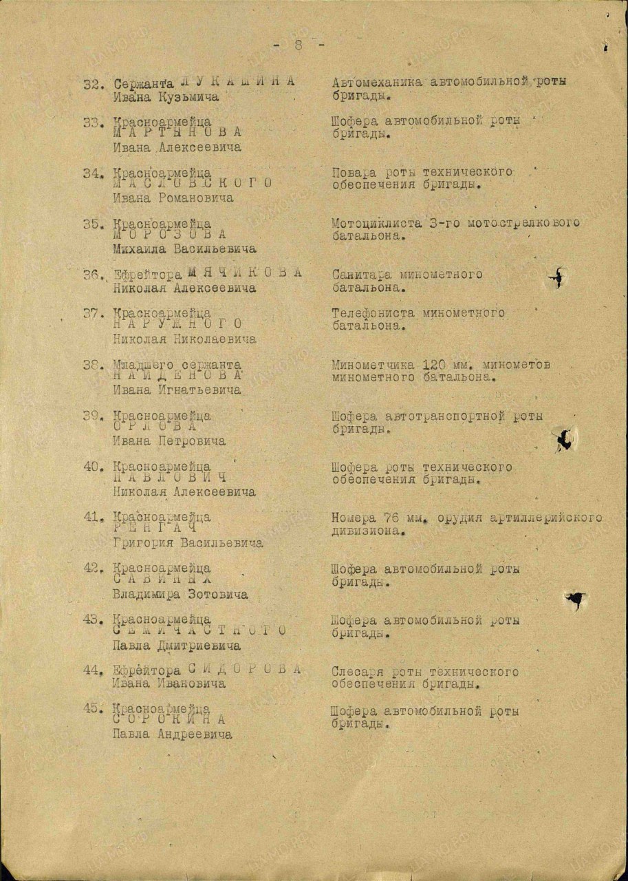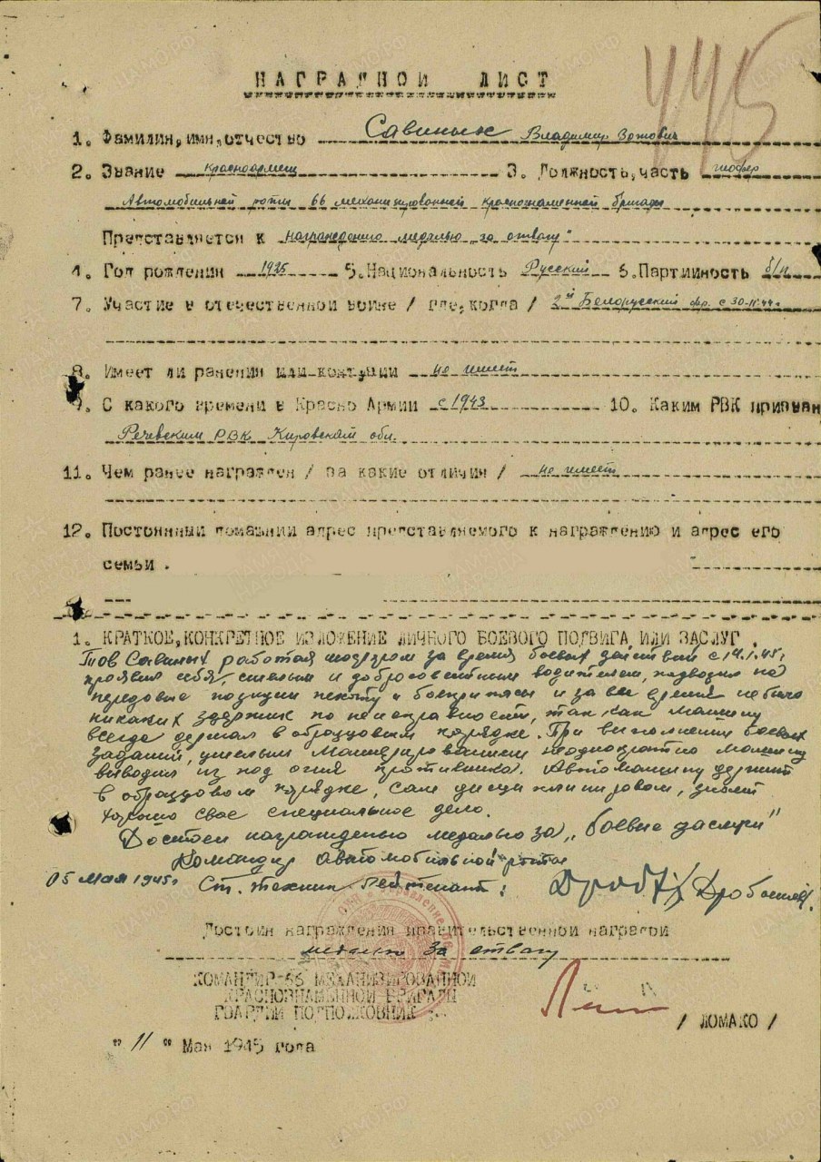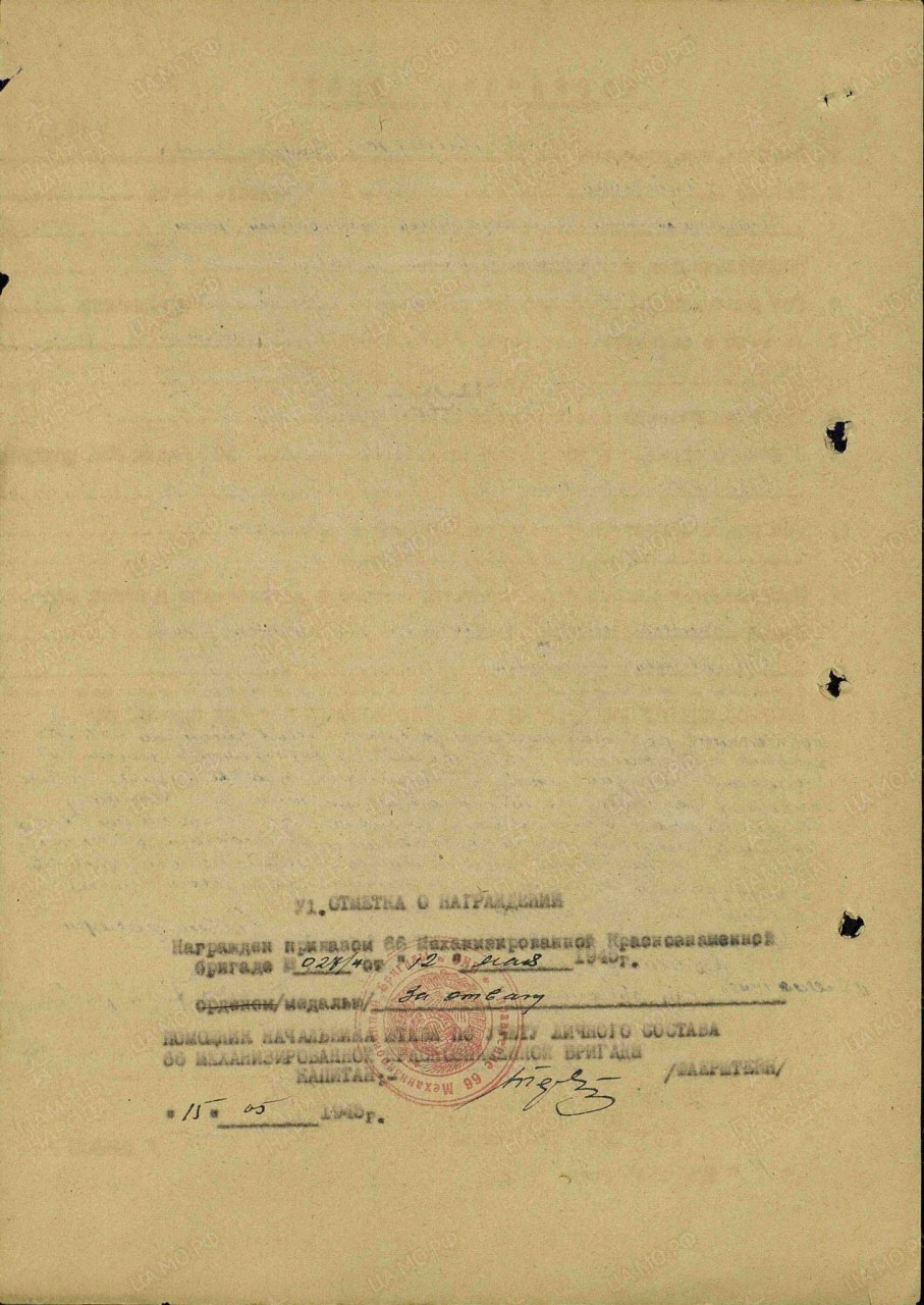 | Награждён: Медаль «За победу над Германией в Великой Отечественной войне 1941–1945 гг.» | 09.05.1945 | Воинское звание: рядовой Наименование награды: Медаль «За победу над Германией в Великой Отечественной войне 1941–1945 гг.» Дата документа: 09.05.1945 Информация об архиве - Архив: ЦАМО Фонд ист. информации: Картотека награждений Дело ист. информации: шкаф 75, ящик 13 | |