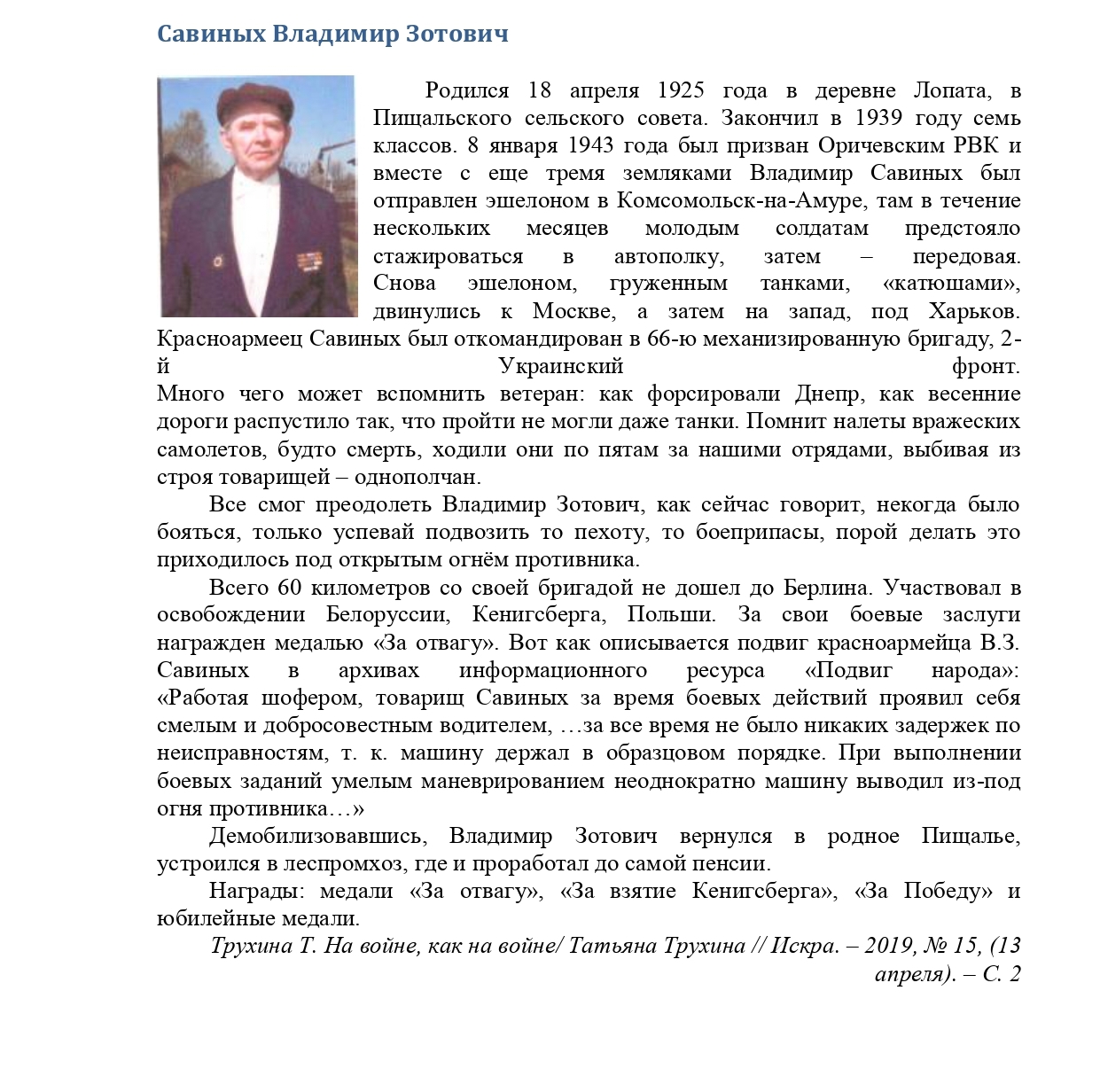 | участие в Великой Отечественной войне | 1943 - 09.05.1945 | Воинское звание рядовой ; красноармеец Воинская часть 66 механизированная бригада. Освобождал Украину, Польшу, Белорусию города Европы, штурмовал неприступную немецкую крепость Кенигсберг, лишь 60 километров не дошел до Берлина. | |