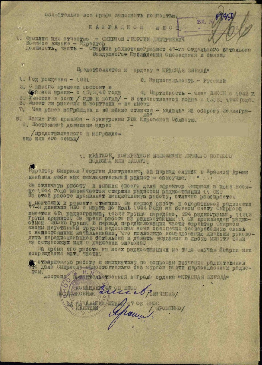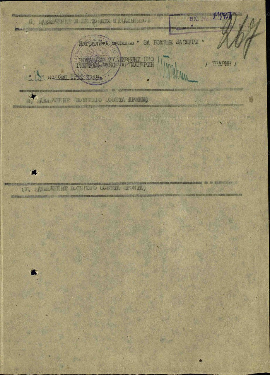 | Награждён: Медаль «За боевые заслуги» | 19.11.1944 | Воинское звание: ефрейтор Воинская часть: 77 дивизия ПВО Наименование награды: Медаль «За боевые заслуги» Приказ подразделения №: 7/н от: 19.11.1944 Издан: 77 див. ПВО Информация об архиве - Архив: ЦАМО Фонд ист. информации: 33 Опись ист. информации: 687572 Дело ист. информации: 1572 Информация об архиве - Архив: ЦАМО Картотека: Картотека награждений Расположение документа: шкаф 80, ящик 23 | |