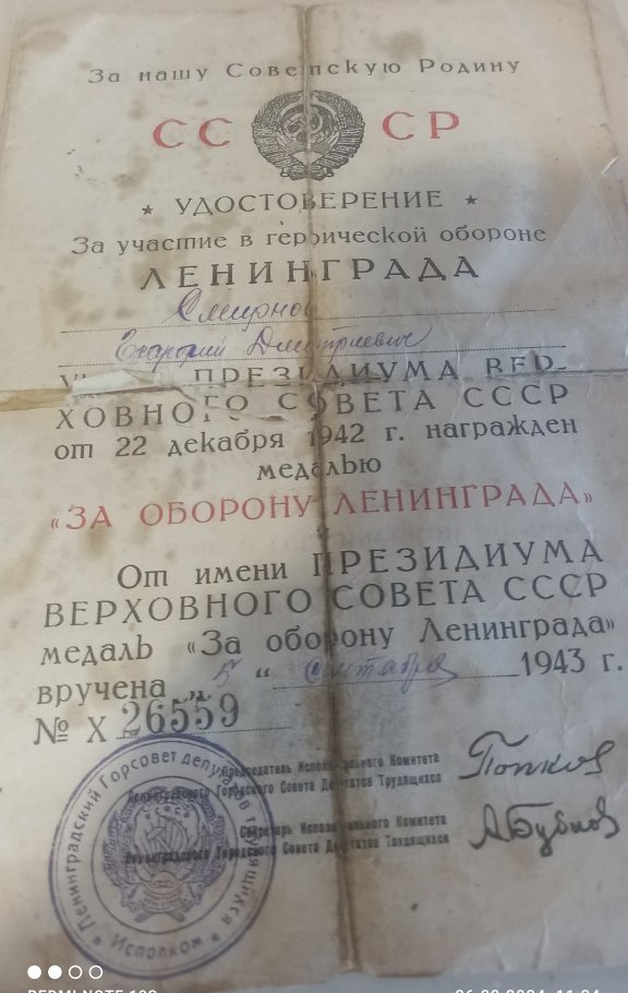 Демобилизован 23.01.46 по ранению, контузия, награждён медалью За оборону Ленинграда, охранял Дорогу жизни "