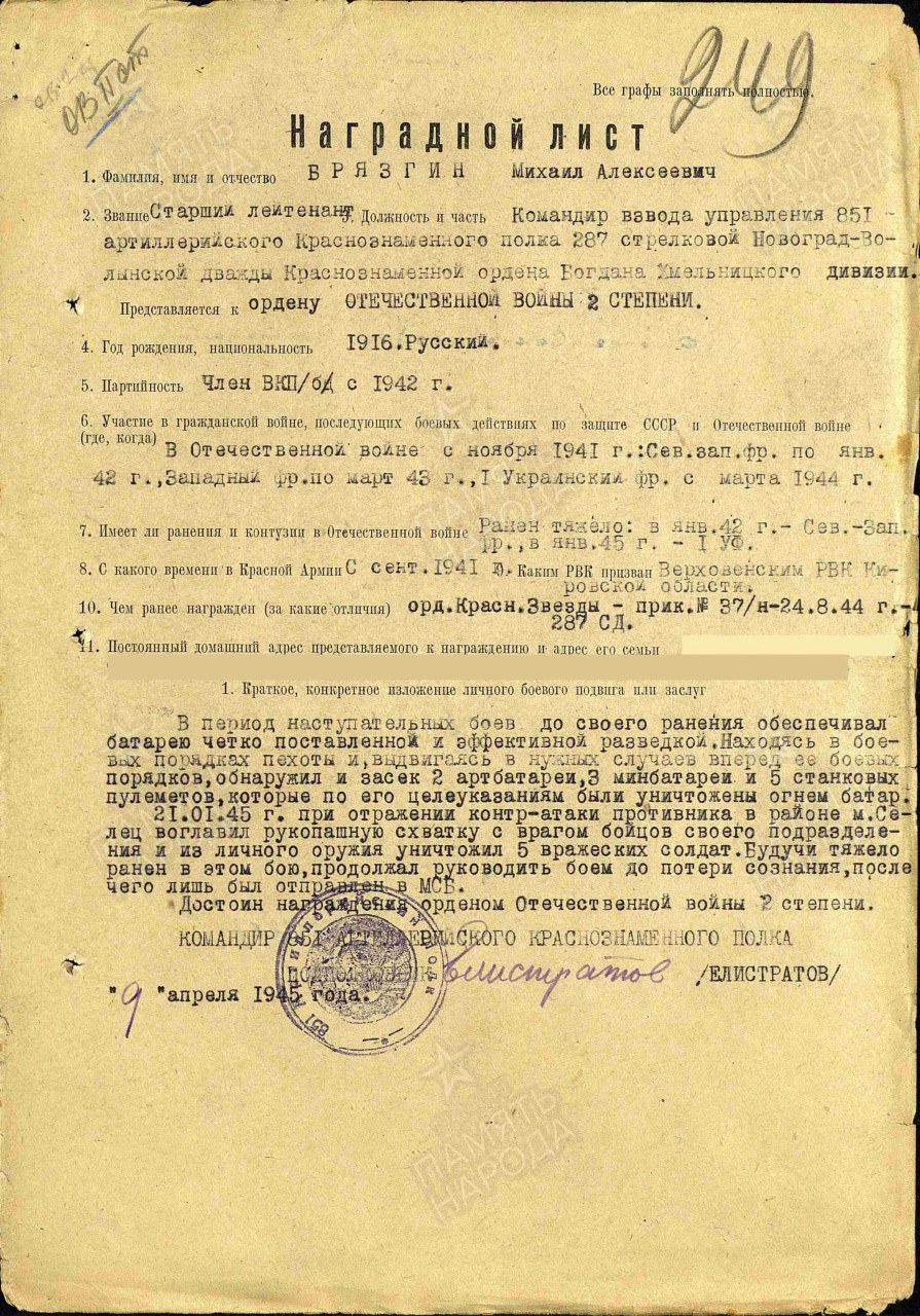 | 4314043019 | БРЯЗГИН Михаил Алексеевич | 1906 г. р., со ст. Юрья Юрьянского п/с, призван Кировским ГВК, ст. лейтенант, командир взвода 287 сд, 851 ап, 29.01.1945 г. пропал без вести в Германии, в районе д. Херн. | Кировская область, Юрьянский район | |||