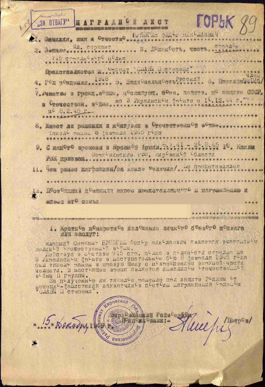 Дата и место призыва: Верховинский РВК, Кировская обл., Верховинский р-н