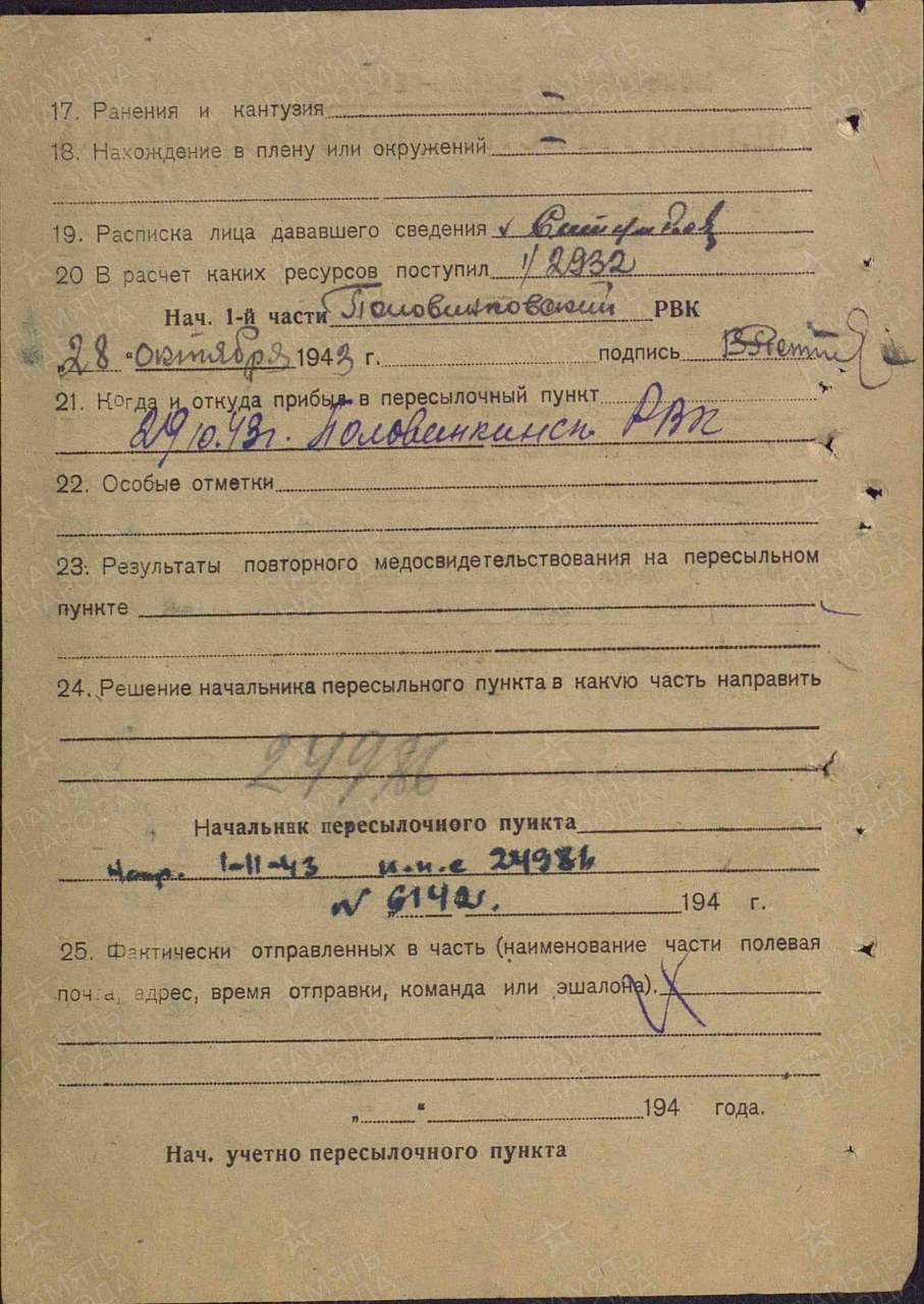 Военно-пересыльный пункт: Молотовский военно-пересыльный пункт, Молотовская обл., г. Молотов Выбытие из воинской части: 01.11.1943