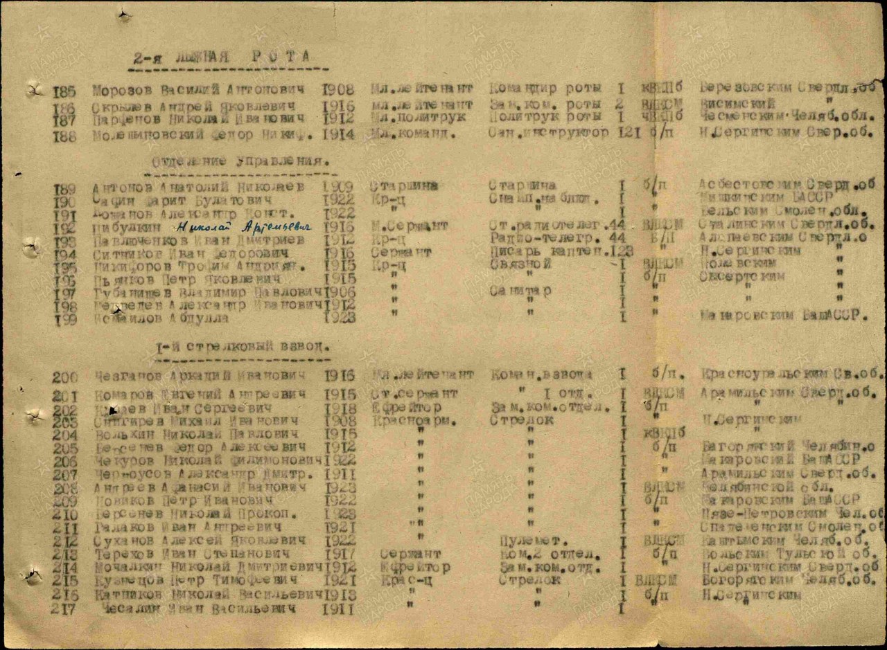 Дата и место призыва: 10.09.1941 Нижне-Сергинский РВК, Свердловская обл., Нижне-Сергинский р-н