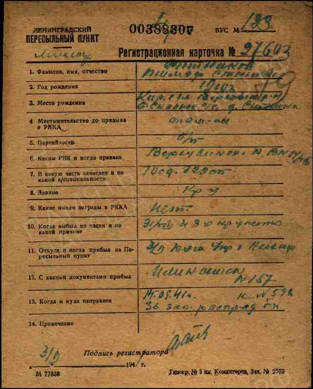 Военно-пересыльный пункт: Ленинградский военно-пересыльный пункт, Ленинградская обл., г. Ленинград Выбытие из воинской части: 14.09.1941