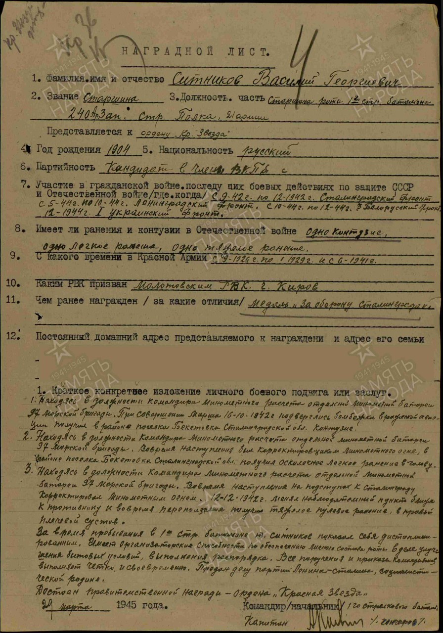 Дата и место призыва: __.06.1941 Молотовский РВК, Кировская обл., г. Киров, Молотовский р-н