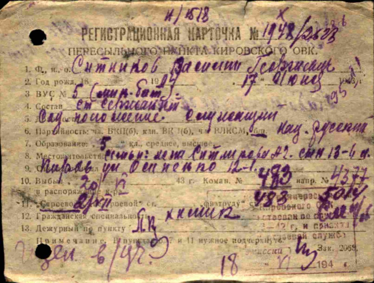 Военно-пересыльный пункт: Военно-пересыльный пункт Кировского областного военкомата, Кировская обл. Выбытие из воинской части: 20.06.1943