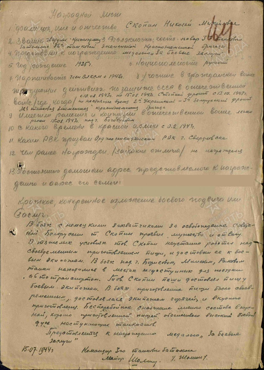 Дата и место призыва: __.02.1943 Орджоникидзевский РВК, Свердловская обл., г. Свердловск, Орджоникидзевский р-н