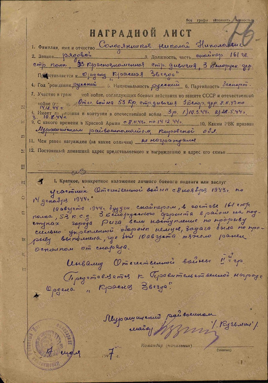 Дата и место призыва: 08.11.1943 Мурашинский РВК, Кировская обл., Мурашинский р-н