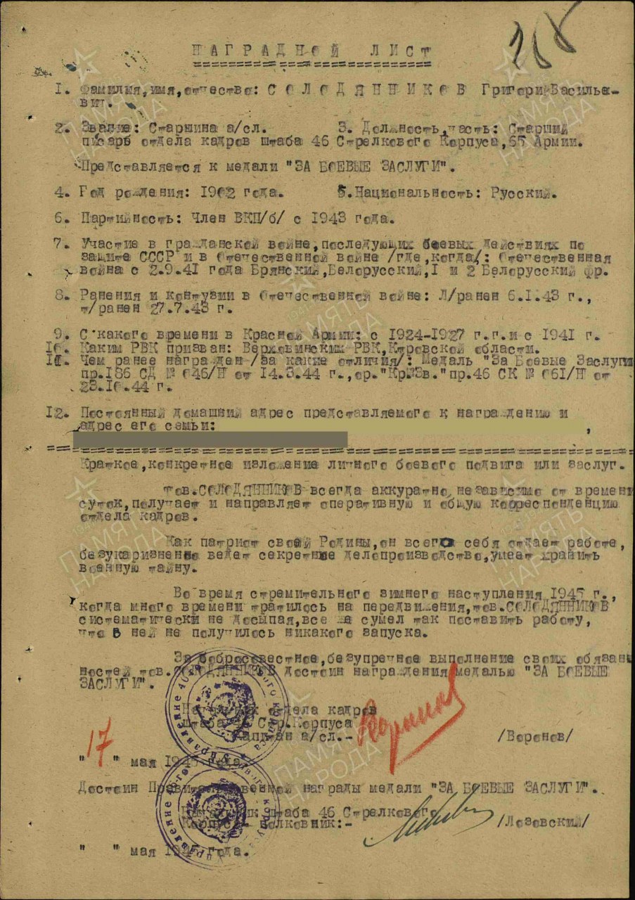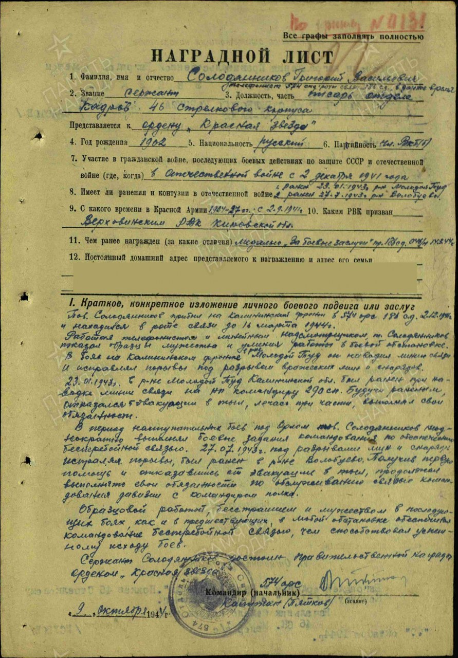 Наименование награды: Орден Красной Звезды Воинское звание: сержант Воинская часть: 46 ск Приказ подразделения №: 61/н от: 23.10.1944 Издан: 46 ск 65 А 1 Белорусского фронта