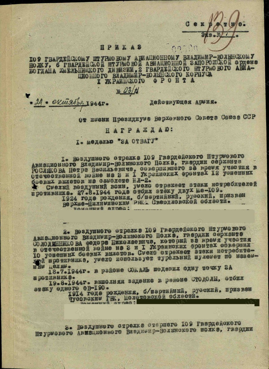 Наименование награды: Медаль «За отвагу» Воинское звание: гв. сержант Воинская часть: 109 гв. шап Приказ подразделения №: 3/н от: 29.10.1944 Издан: 109 гв. шап 6 гв. шад 2 гв. шак 1 Украинского фронта