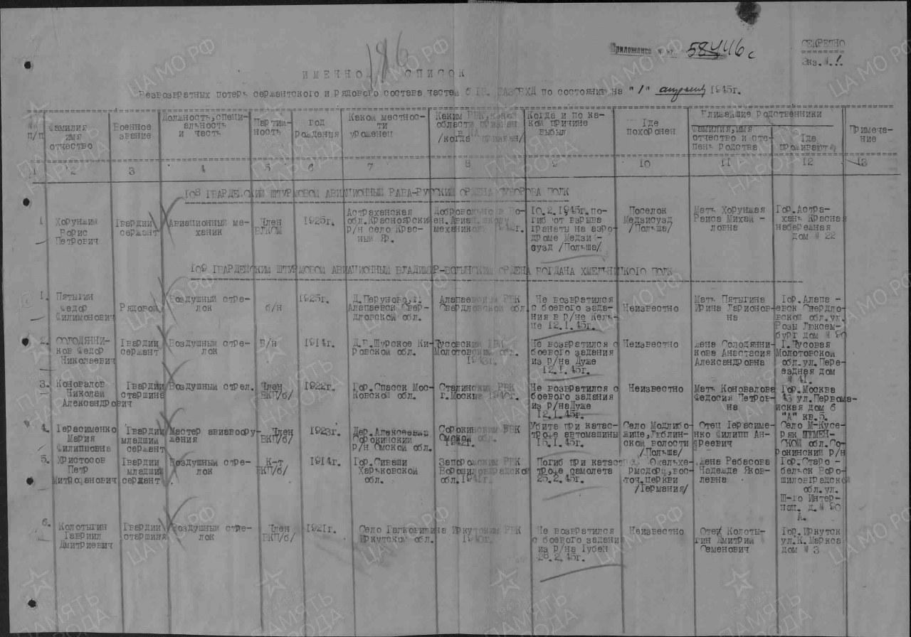 Последнее место службы: 6 гв. штурм. ад 109 гв. штурм. ап