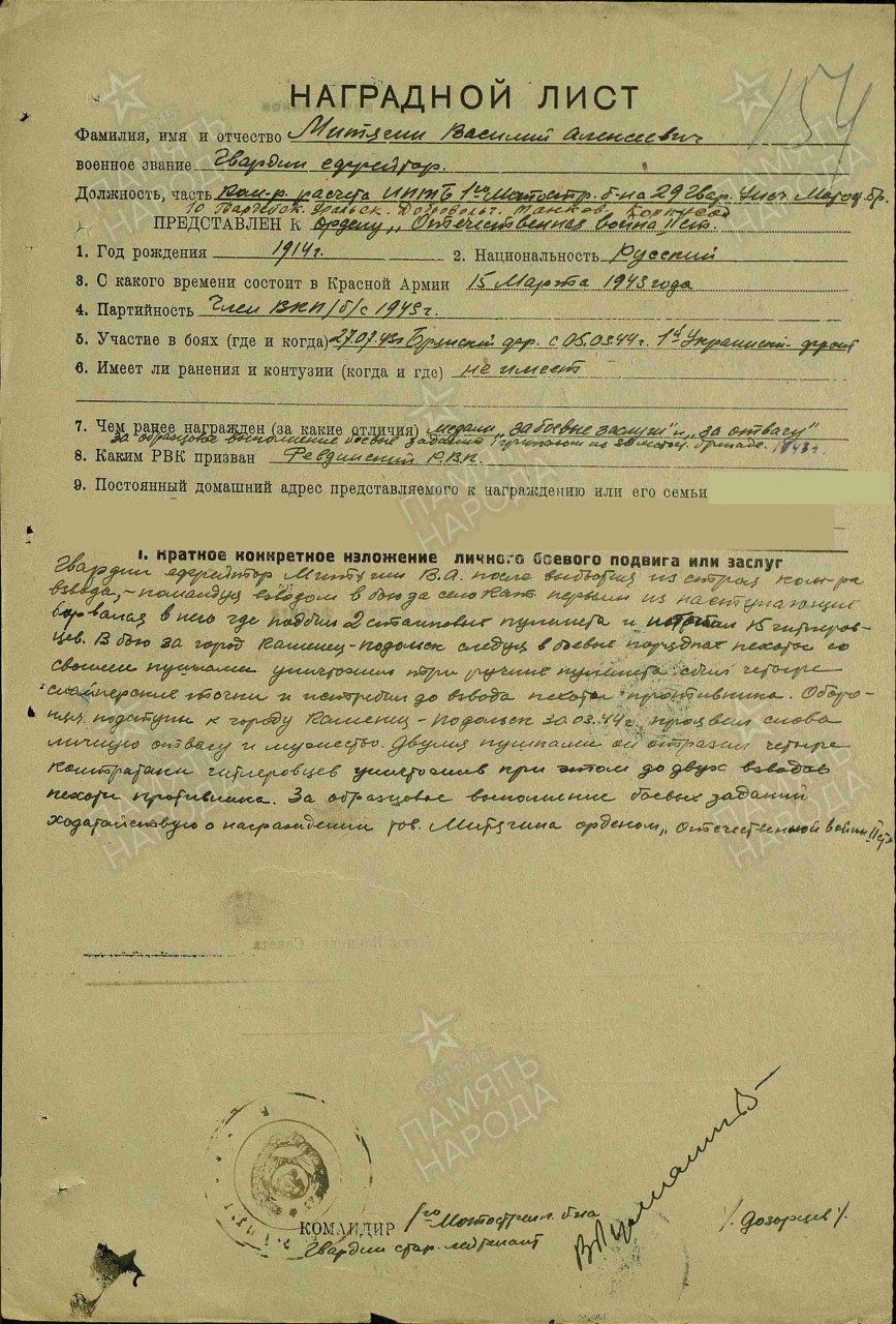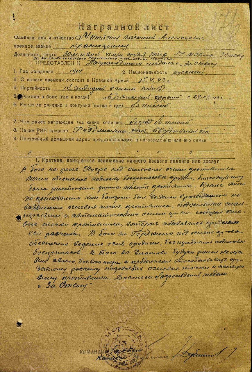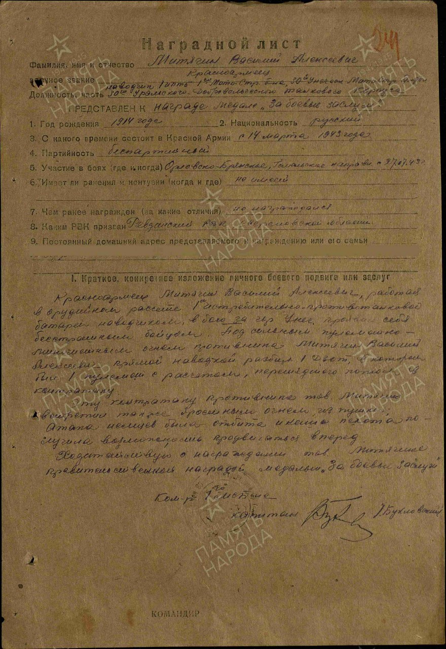 Родился в 1914 году. Работал маркшейдером на Дегтярском руднике. Добровольцем в мае 1943 года ушел на фронт. https://музей-дк-дегтярск.рф/info/kniga-pamyati/mityagin-vasiliy-alekseevich/