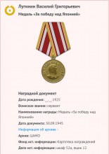 | Награждён: Награжден медалью "За победу над Японией" | 30.09.1945 | Награжден медалью "За победу над Японией" 30.09.1945 г. (ЦАМО карточка награждений шкаф 52а ящик 12) |