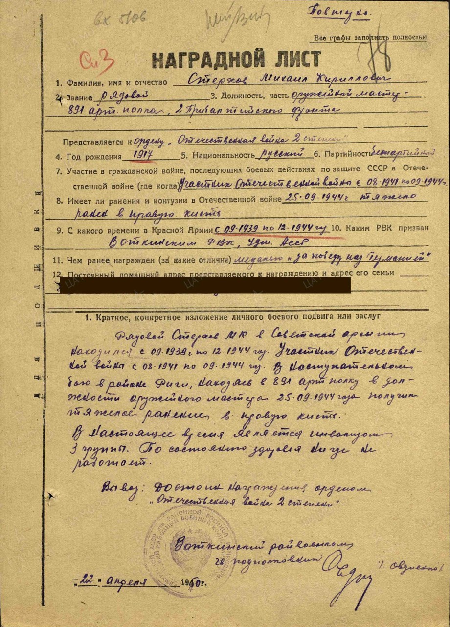 | участие в Великой Отечественной войне | Август 1941 - Декабрь 1944 | Воинское звание красноармеец Воинская часть 409 стрелковая дивизия Воинская часть 891 артиллерийский полк 332 стрелковой дивизии | |