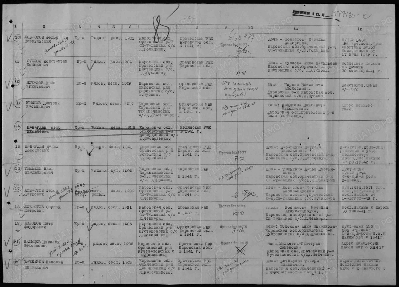 | 4308478020 | ШАБАРДИН Даниил Дорофеевич | 1891 г. р., д. Жеребчиха Боневского с/с, красноармеец, рядовой, в июне 1942 г. пропал без вести. | Кировская область, Оричевский район |