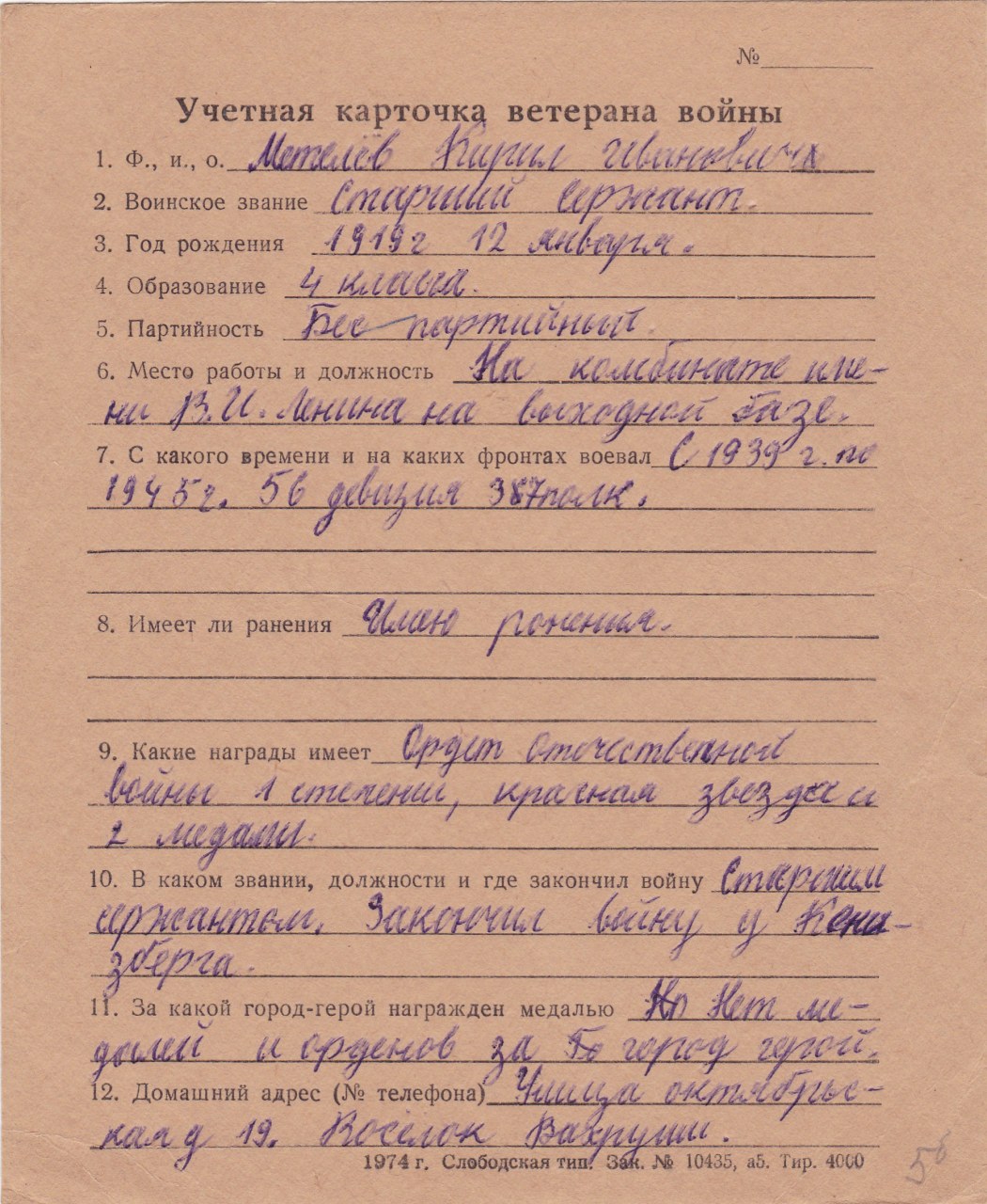 Учетная карточка ветерана войны // Музей Вахрушевской школы.