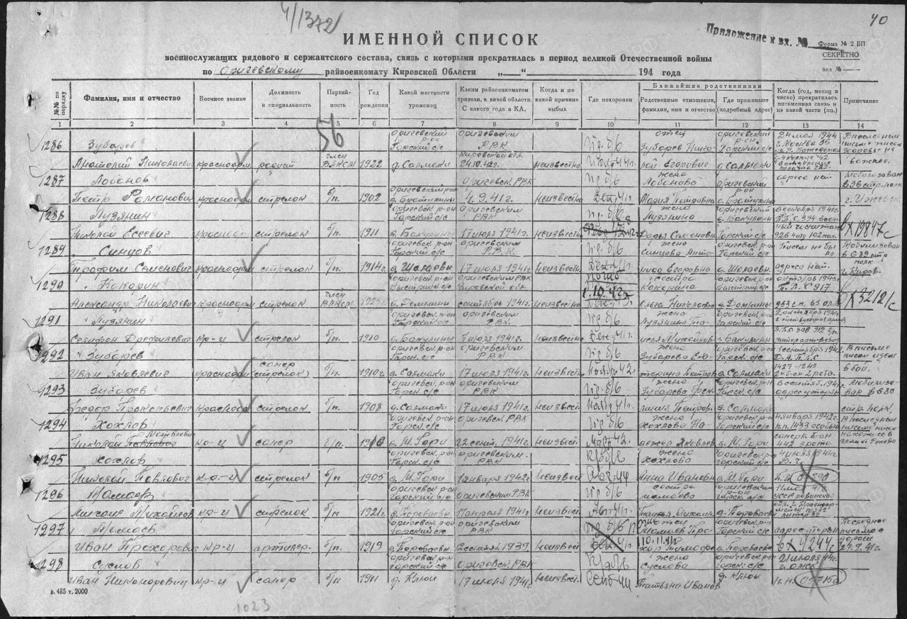 Зубарев Иван Яковлевич, 1910 г.р., из д. Салмаки Гарского с/с Оричевского района. Мобилизован 18.07.1941 г. Оричевским РВК в 689 сп. Фактически: красноармеец, сапер. Последнее письмо 01.09.1942 г. Д.А.П.П.С. 1427-1242, 2 бат., 2 рота. Писал «Идем в бой». Был ранен. выбыл из госпиталя 03.11.1941 г. Считается пропавшим без вести в ноябре 1942 г.