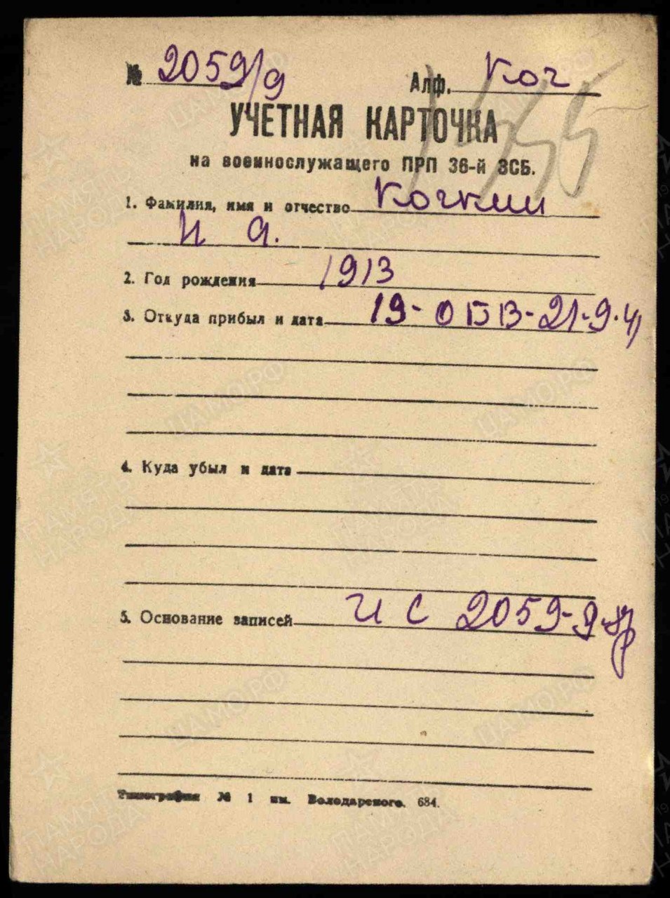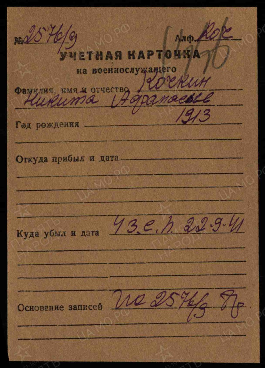 Кочкин Никита Афанасьевич, 1913 г.р., из д. Репные Камешницкого с/с Оричевского района. Мобилизован 18.07.1941 г. Оричевским РВК в команду 903. ВУС - 6. Красноармеец, 311 сд (предположительно). Попал в 68 сп. Ранен. Выбыл 31.08.1941 г. из СЭГ 1170 в госпиталь 2234. 19 ОБВ (до 21.09.1941 г.), 36 зсбр, 4 зап, 56 зсп. Последнее письмо 14.11.1941 г. Адрес: Ленинградская обл. Всеволожск. п/о п/я 71 литер 8. Считается пропавшим без вести в январе 1942 г.