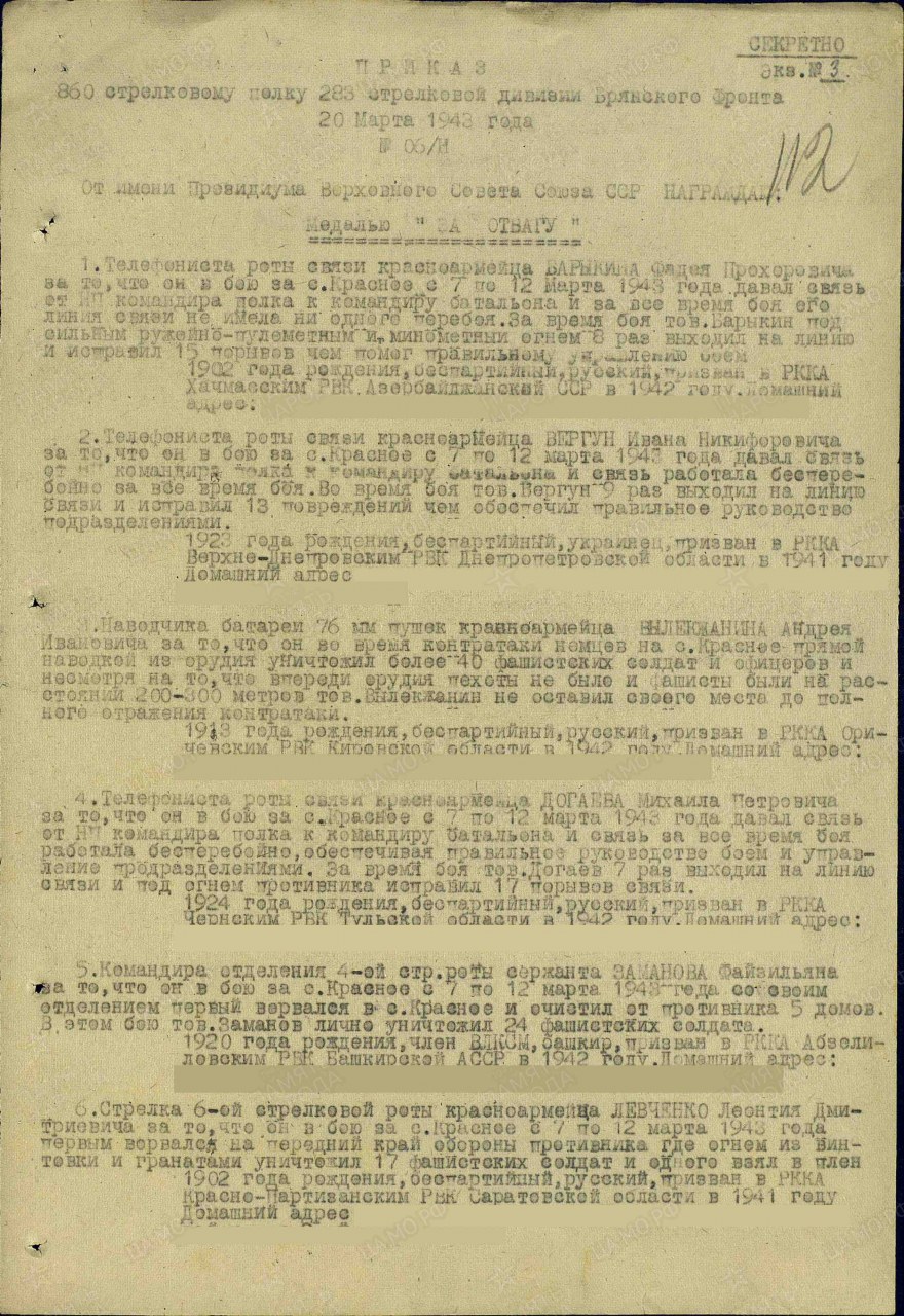 | Награждён: Медаль «За отвагу» | 20.03.1943 | Приказ № 6/н по 860 сп 283 сд Брянского фронта. | |