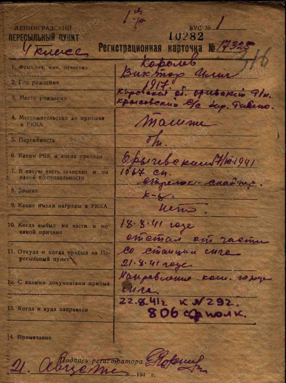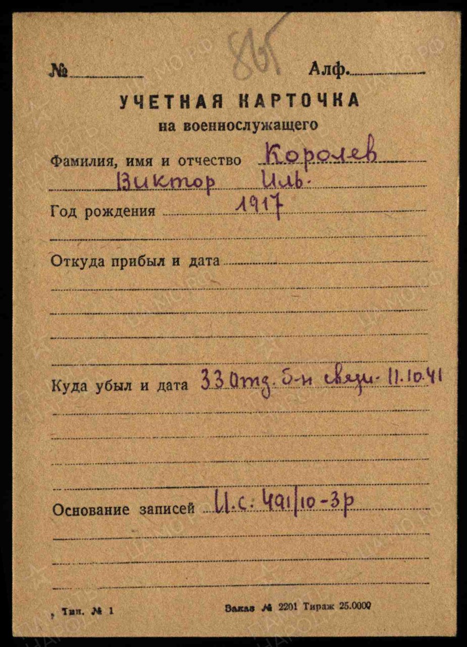 Королев Виктор Ильич, 1917 г.р., из д. Репины Крысовского с/с Оричевского района. До мобилизации работал продавцом в Истобенском сельпо. Мобилизован 18.07.1941 г. Оричевским РВК в команду 903. Фактически: красноармеец, стрелок-снайпер, 1067 сп 311 сд. Отстал от части 18.08.1941 г. Ленинградский ВПП (21-22.08.1941 г.). 806 сп. Ранен. Выбыл 06.09.1941 г. из ЭГ 1170 в 2 БВ. 36 зсд (до 11.10.1941 г.) 33 отдельный батальон связи; 169 сп Выбыл 04.12.1941 из ЭГ 1170 в госпиталь 924. Рядовой, телефонист роты связи 942 сп. Ранен. Из ЭГ 2222 выбыл 30.06.1944 г. в ЭГ 3412. 389 зсп (до 02.08.1944 г.), 109 сд. Награжден: медаль «За боевые заслуги», орден Славы III степени.