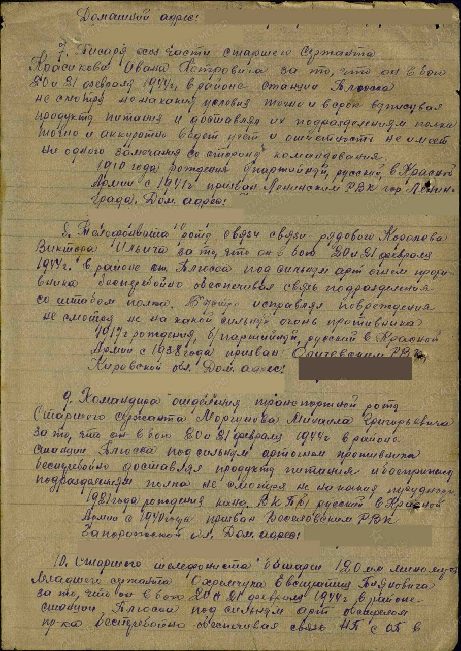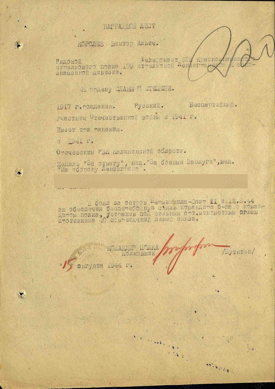 | Награждён: Орден Славы III степени | 19.08.1944 | Приказ № 70/н по 109 сд Ленинградского фронта | |