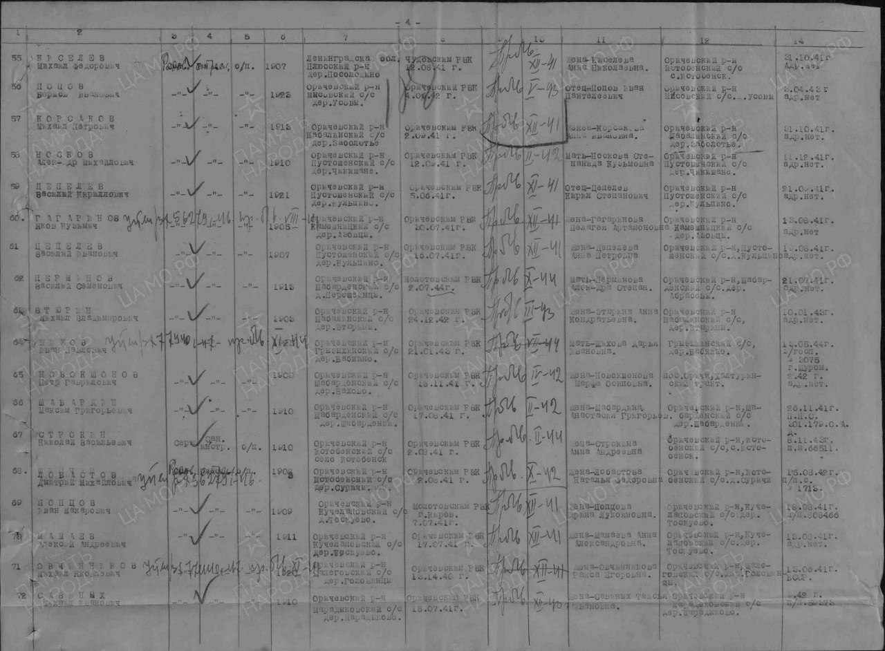 (Источники информации: Алфавитная книга призванных по мобилизации в период Великой Отечественной войны Оричевским РВК Кировской области на «М», листы 3 об, 4, № 55; ЦАМО. Фонд: 58. Опись: 977520. Дело: 955; дело № 2302 Оричевского райотдела социального обеспечения)