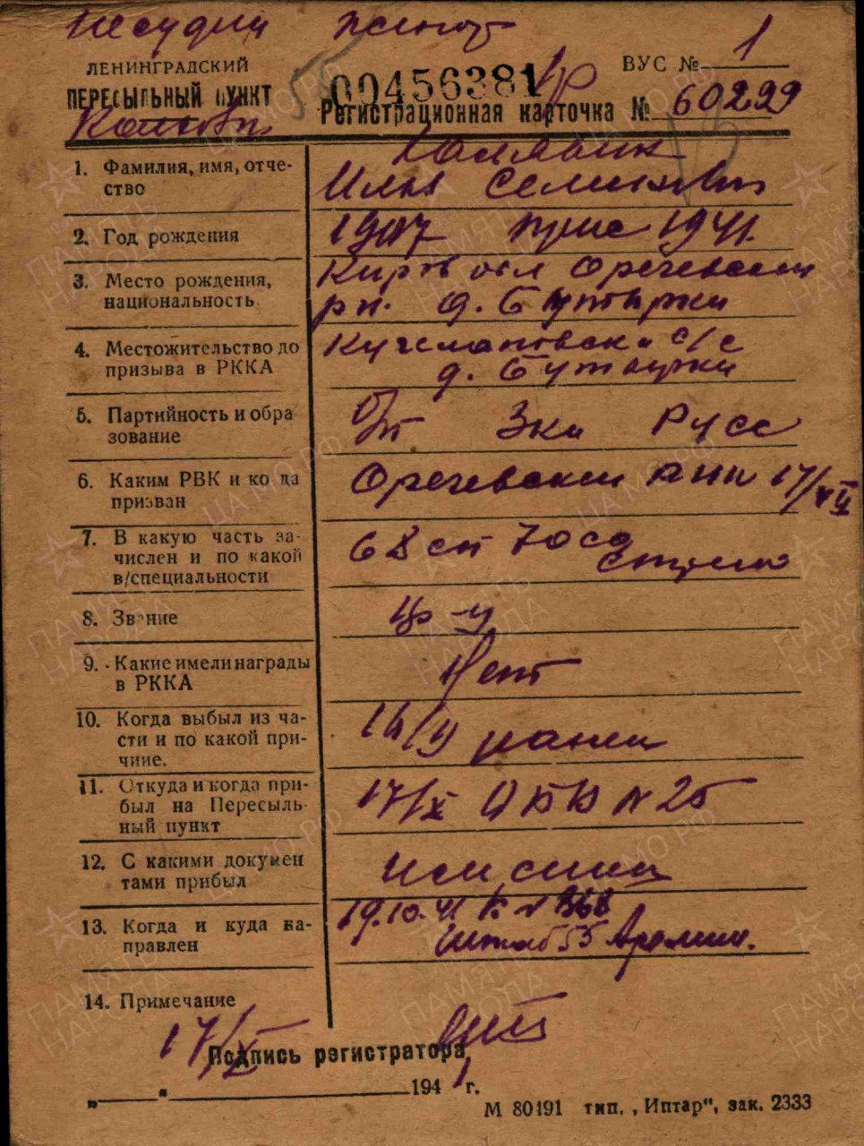 Халявин Илья Семенович, 1907 г.р., из д. Бутырки Кучелаповского с/с Оричевского района. Мобилизован 18.07.1941 г. Оричевским РВК в 689 сп. Фактически: красноармеец, 5 рота 2 батальон 1067 сп 311 сд (принял присягу 24.07.1941 г. в г. Кирове); рядовой, стрелок, 68 сп 70 сд; 28.08.1941 вышел из окружения в р-не Тосно на Ленинградский ВПП (31.08.-02.09.1941) выбыл в 70 див. 221 ап, 16.09.1941 ранен, из ЭГ 2222 в тыл 18.09.41; 25 ОБВ, Ленинградский ВПП (17-19.10.1941) (68 сп, 70 сд), выбыл в 55 А, ЭГ 1170 выбыл в госпиталь 992 04.11.1941 (952 сп), последнее письмо 07.12.1941 в/госпиталь № 922?. ВГ 992 выбыл в БВ (952 сп) 09.12.41. Выбыл 19.12.41. в 8 А. Последний адрес: г. Ленинград п/я 555 3 отд. Считается пропавшим без вести в феврале 1942 г.