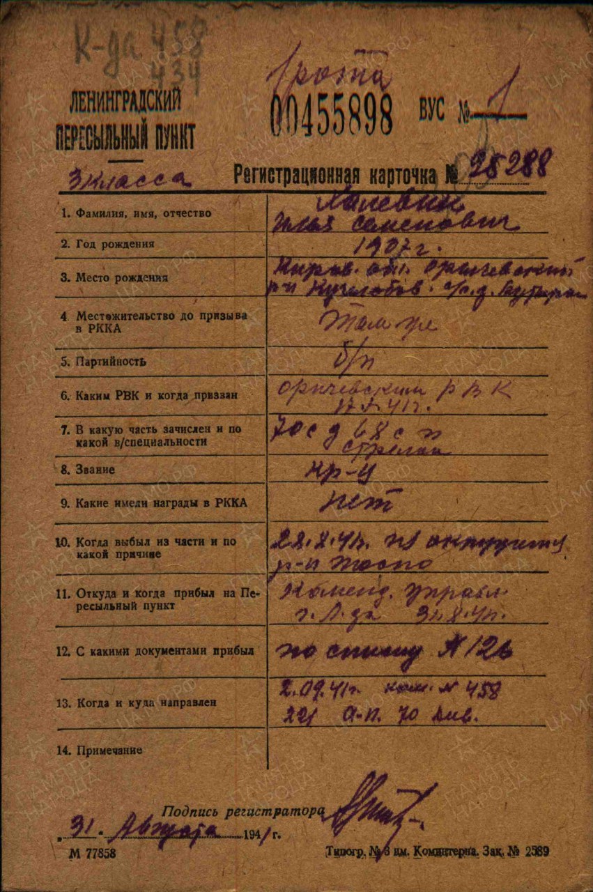 (Источники информации: Алфавитная книга призванных по мобилизации в период Великой Отечественной войны Оричевским РВК Кировской области на «Х, Ц, Ч», листы 3 об, 4, № 50; ЦАМО. Фонд: Ленинградский ВПП. Опись: 530167. Дело: 43284, 43285; Фонд: 58. Опись: 977520. Дело: 260; Филиал ЦАМО (Архив военно-медицинских документов). Картотека: Ленинградская картотека. Госпиталь 2222. Фонд: Картотека ранений. Опись: Ленинградская картотека. Госпиталь 2222. Номер ящика: 281-11; Фонд: 7737. Опись: 74237. Дело: 8; дело № 461 Оричевского райотдела социального обеспечения)