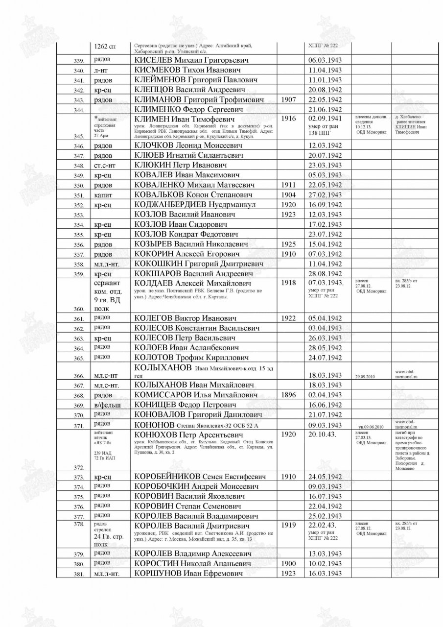 | 4308344002 | КОКОРИН Алексей Егорович | 1910 г. р., д. Мохначи, Гарского с/с, красноармеец, стрелок, 86 осб, 07.03.1942 г. погиб в бою. Захоронен в Новгородской обл., Молвотицкий р-н, д. Антоново. | Кировская область, Оричевский район |