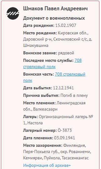 | Погиб | 12.12.1941 | Финляндия. Пера-Похьела губ., окр.Рованиеми, Кемиярви, Пуйкола, Тасасенкангас | Погиб в плену. |