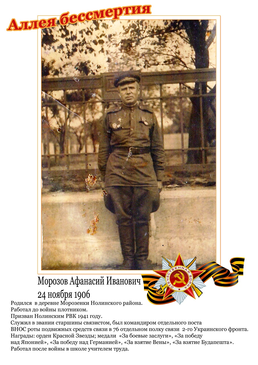 | Родился ребёнок: Морозов Иван Афанасьевич | 1924 | деревня Морозенки (Афанасьевский) (Верхошижемский район, Кировская область) - ныне не существует | Участник ВОв. Красноармеец. Погиб 30.01.1945 |
