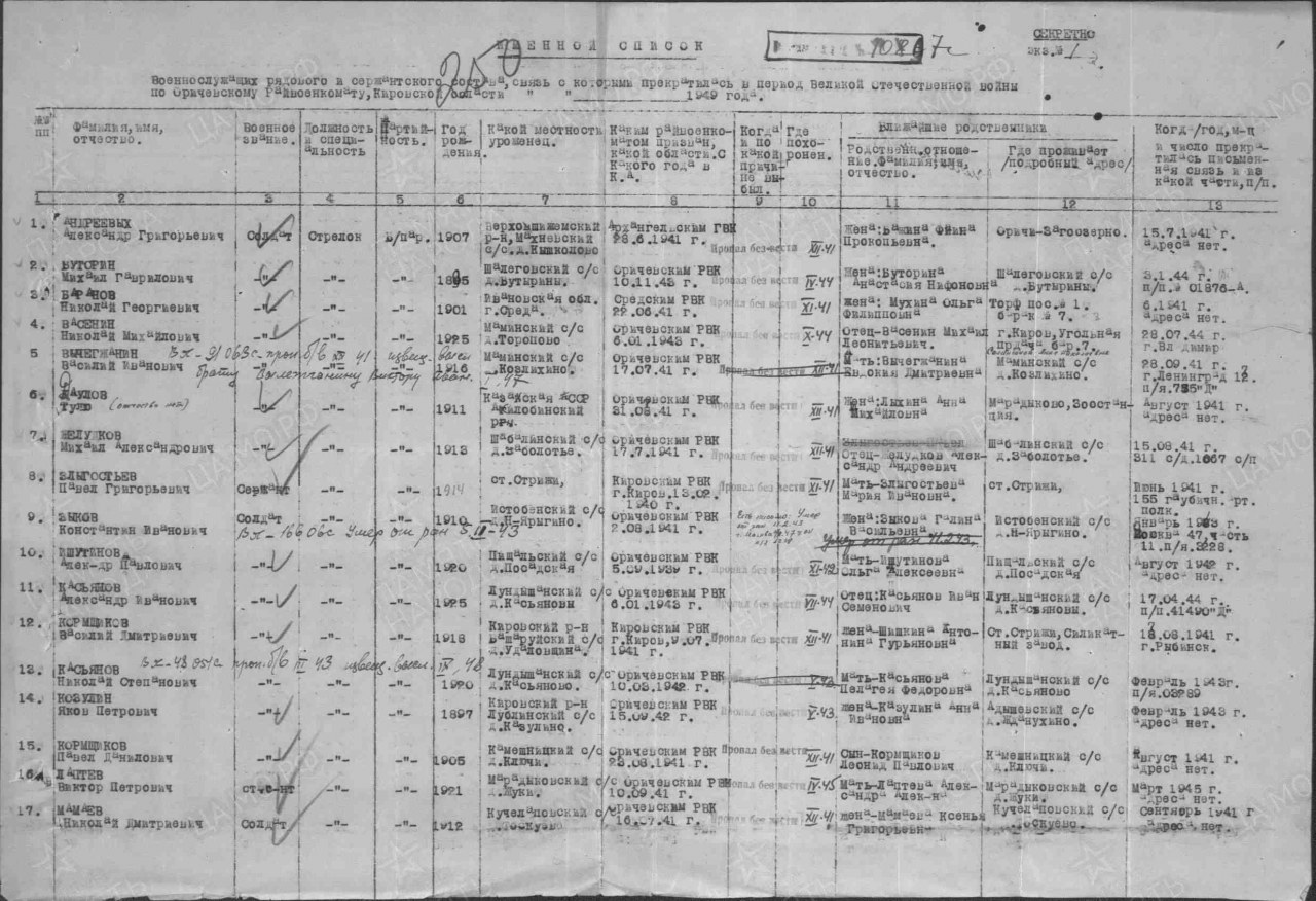 | 4308382005 | МАМАЕВ Николай Дмитриевич | 1912 г. р., д. Тоскуево, Кучелаповского с/с., солдат, стрелок, в декабре 1941 г. пропал без вести. | Кировская область, Оричевский район |