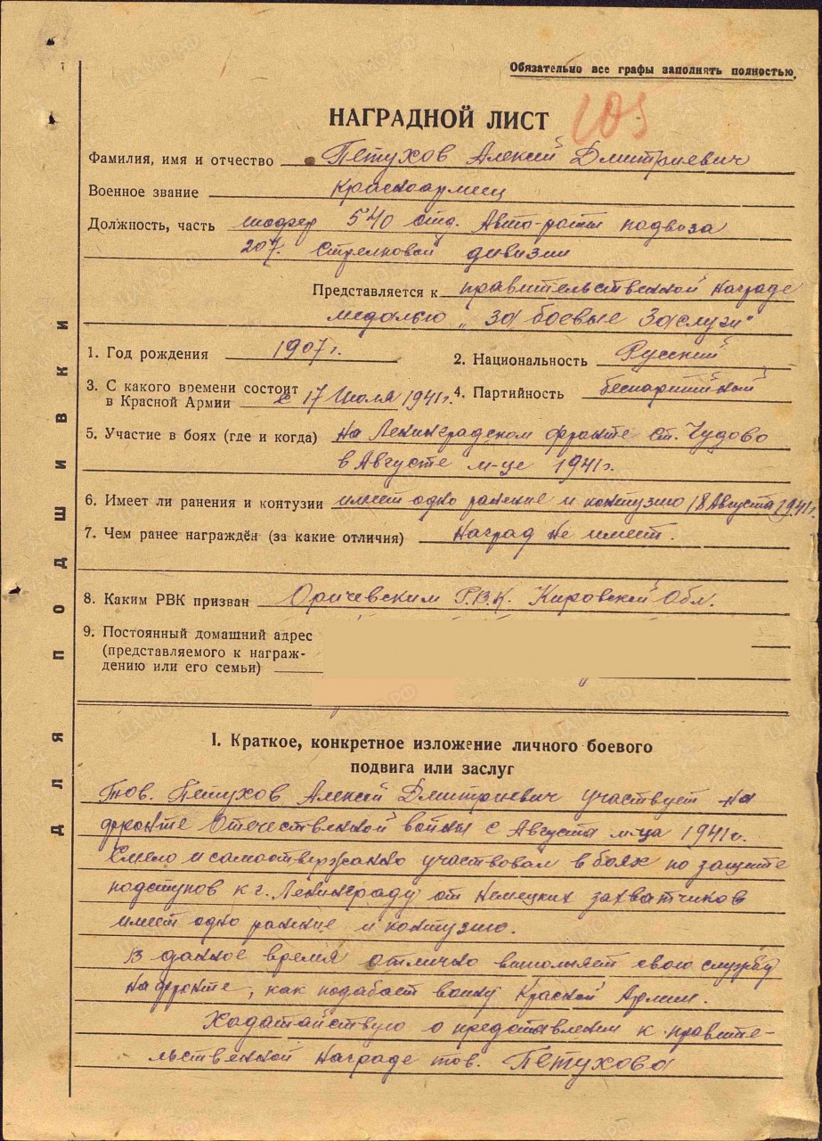 Петухов Алексей Дмитриевич, 1907 г.р., из д. Петухи Коршинского с/с Оричевского района. Мобилизован 18.07.1941 г. Оричевским РВК в 689 сп. Фактически: красноармеец, 3 рота 1-го батальона 1067 сп 311 сд (принял присягу 24.07.1941 г. в г. Кирове). Ранен 18.08.1941 г. 23.08.1941 г. выбыл из СЭГ 1170 в ВСП 305/3803 (1067 сп, только имя Александр). Красноармеец, шофер, 540 отдельная авторота развоза 207 сд. Награды: медаль "За боевые заслуги"