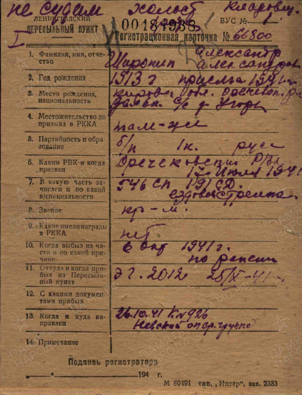 Широнин Александр Александрович, 1914 (1913) г.р., из д. Угор Вальковского с/с Оричевского района. Мобилизован 18.07.1941 г. Оричевским РВК в 689 сп. Фактически: красноармеец, 311 сд (предполагается). 546 сп 191 сд. Ранен. ЭГ 2012. Ленинградский ВПП (25-26.10.1941 г.). выбыл в Невскую оперативную группу. Последнее письмо в ноябре 1941 г. Адреса нет. Считается пропавшим без вести в феврале 1942 г.