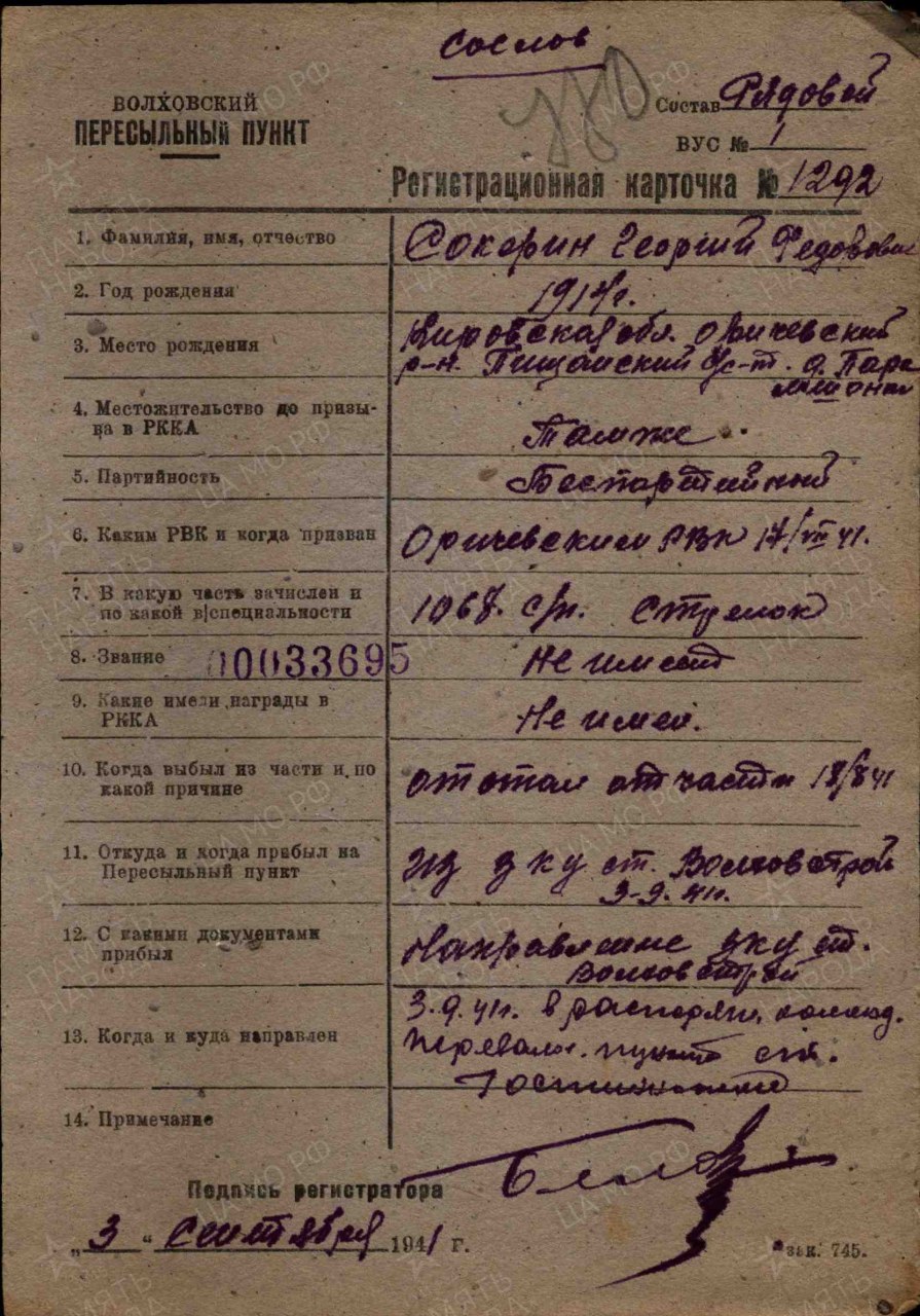 Сокерин Георгий (Егор) Фёдорович, 1914 г.р., из д. Парамшонки Пищальского с/с Оричевского района. Член ВЛКСМ. Мобилизован 18.07.1941 г. Оричевским РВК в 689 сп. Фактически: красноармеец, стрелок, 1067 сп 311 сд. 18.08.1941 г. отстал от части. Волховский ВПП (до 03.09.1941 г.), направлен на ПП ст. Гостинополье. Считается пропавшим без вести в декабре 1941 г. Письмо товарища от 20.09.1941 г. (Ленинградская обл., Волховское отд., ст. Гостинополье, п/я 3 - А).