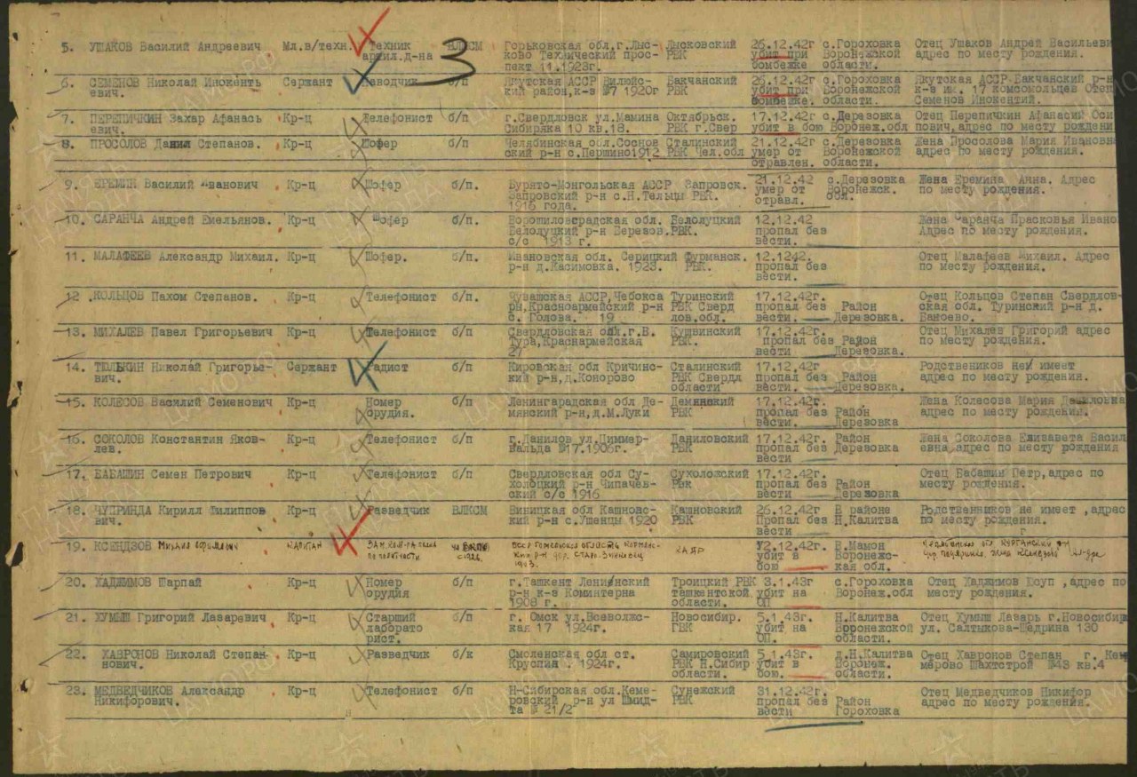 Тюлькин Николай Григорьевич, 1914 г.р., из д. Кокоры Коршинского с/с Оричевского района. Член ВЛКСМ. Мобилизован 18.07.1941 г. Оричевским РВК в 689 сп. Фактически: красноармеец (ВУС-45), радиотелеграфист, 311 сд (предполагается). Сержант, радист, 3 зап (до 30.10.1942 г.). Сталинградский УАЦ. 129 арм. полк, 138 гаубичный ап РГК 8 ад аргк. Считался пропавшим без вести 17.12.1942 г. Место выбытия: Воронежская обл., Ново-Калитвенский р-н, Дерезовский с/с, с. Дерезовка, в районе. Фактически был ранен. Выбыл 07.04.1943 г. из АПГ 3435, ЭГ 1585 со свидетельством о болезни.