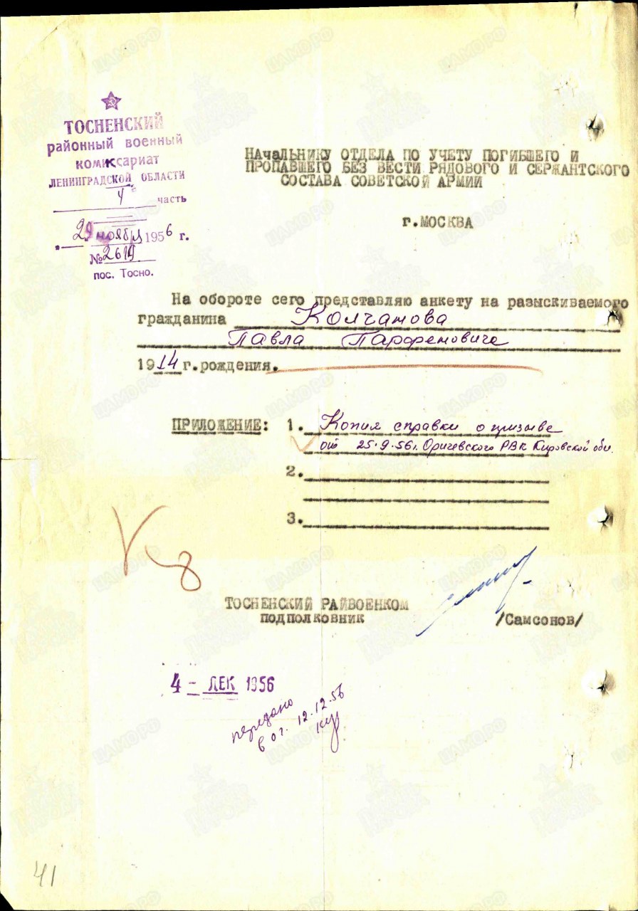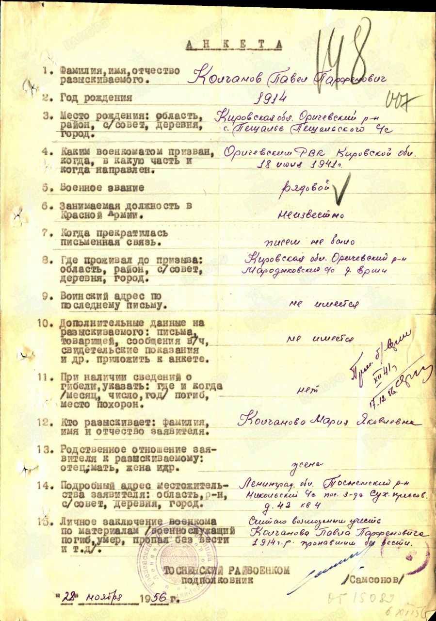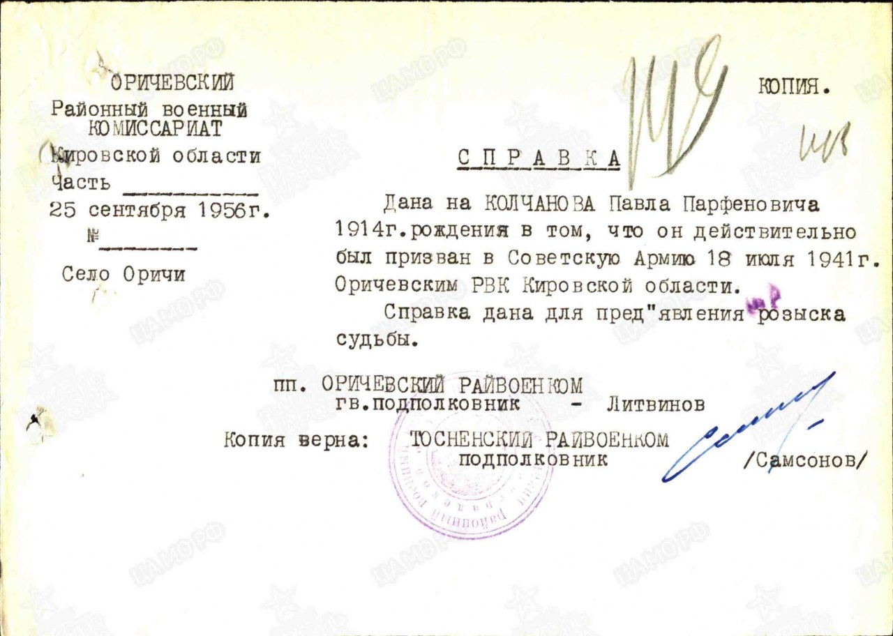 Колчанов Павел Парфенович, 1914 г.р., уроженец д. Заяц Пищальского с/с Оричевского района. До мобилизации проживал в д. Ерши Марадыковского с/с. Мобилизован 18.07.1941 г. Оричевским РВК в команду 903. Фактически: красноармеец, стрелок, 3 рота 1-го батальона 1067 сп 311 сд (принял присягу 24.07.1941 г. в г. Кирове). Командир отделения, 68 сп. Ранен. Из ЭГ 1443 выбыл 13.09.1941 г. в ВМА. Выбыл 10.1941 г. из госпиталя КГ ВМА КА им. Кирова. Писем не было (данные из анкеты). Адреса нет. Считается пропавшим без вести в декабре 1941 г.